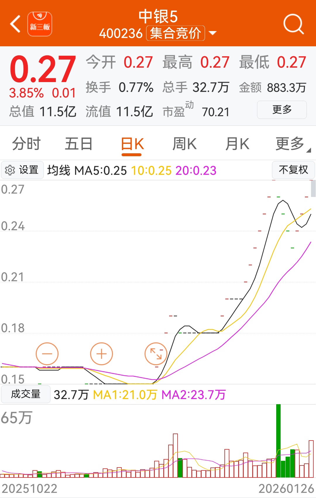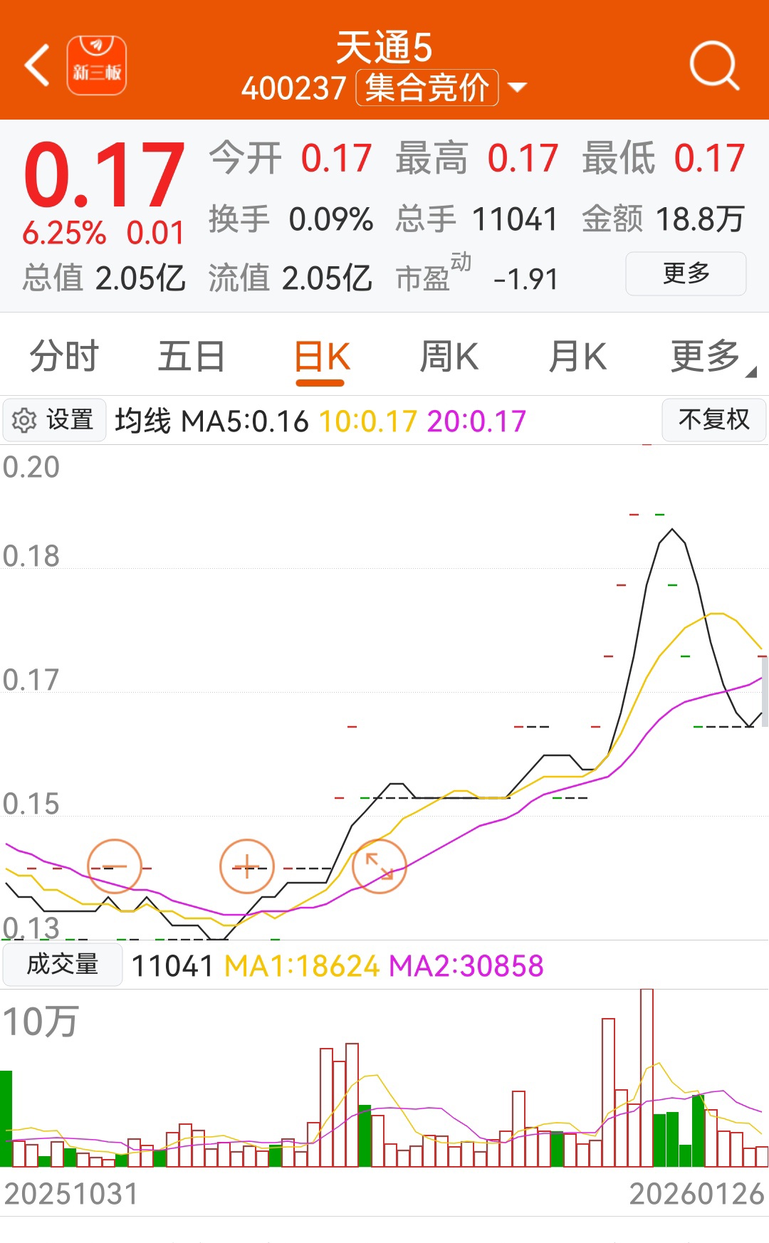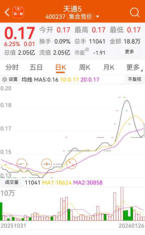 5日股中的中银已经二次启动。目前0.17元的股票中仅天通一家:12.08亿的总股