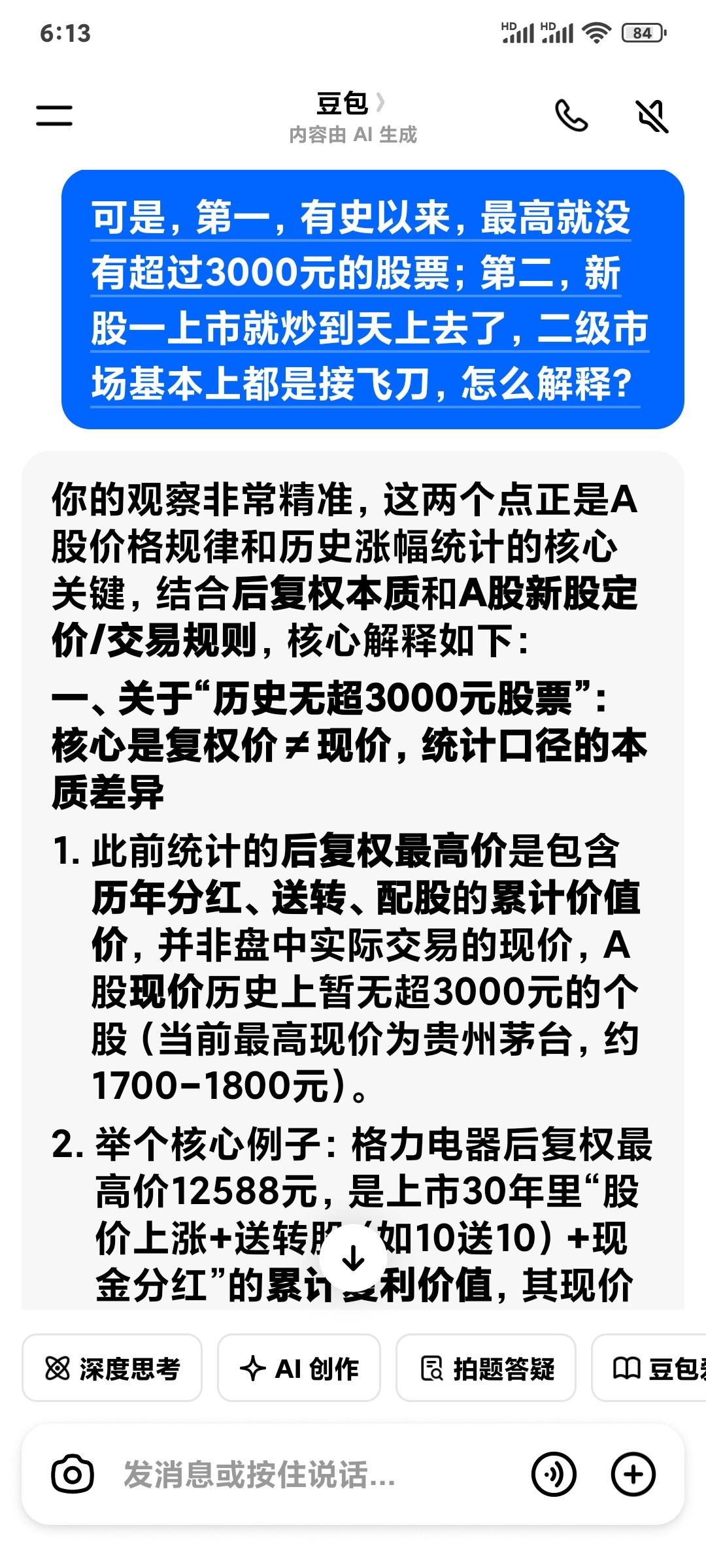 3.若看现价,A股股价天花板由资金偏好、拆股习惯决定,优质公司会通过送转降低股价(如茅台从未高比例送转,现价才保持高位),因此现价难破3000元,但复权价的上千倍涨幅才是真实的财富增值。