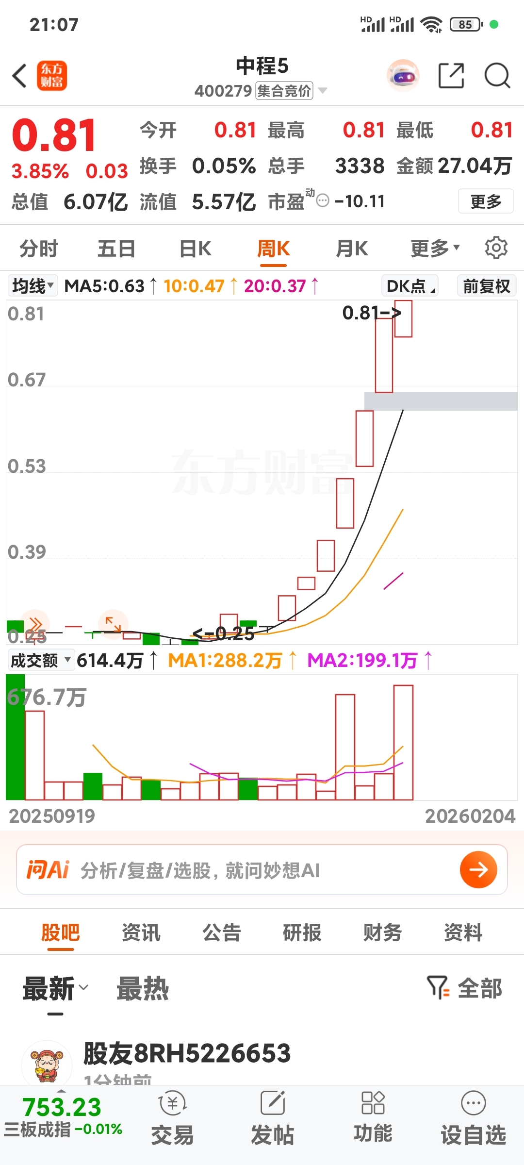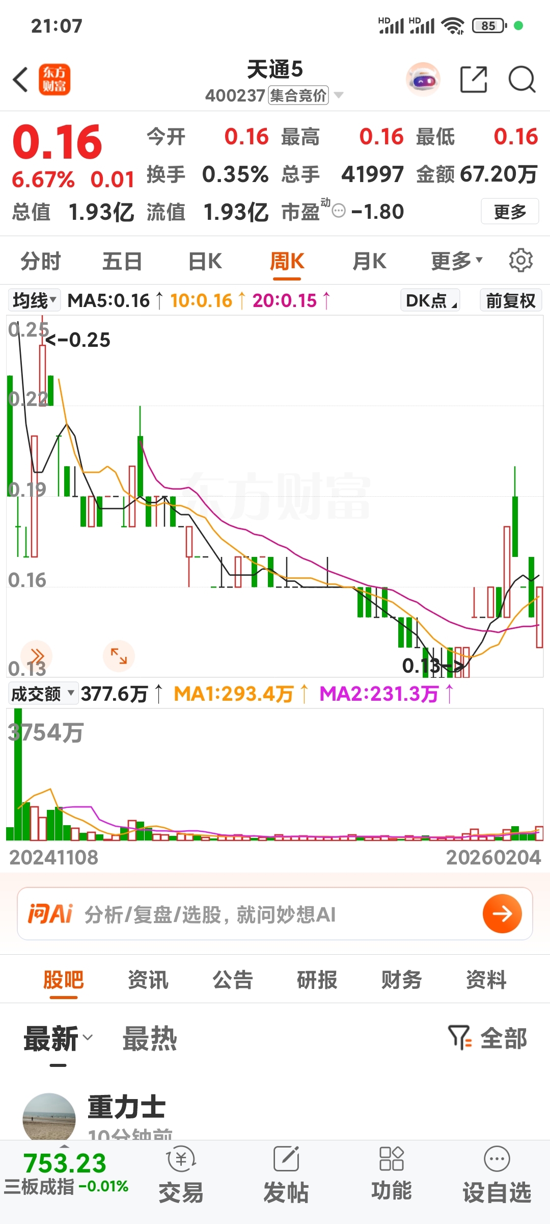 2、按周K线成交量,天通5的阻力位是在0.18元还是0.19元?