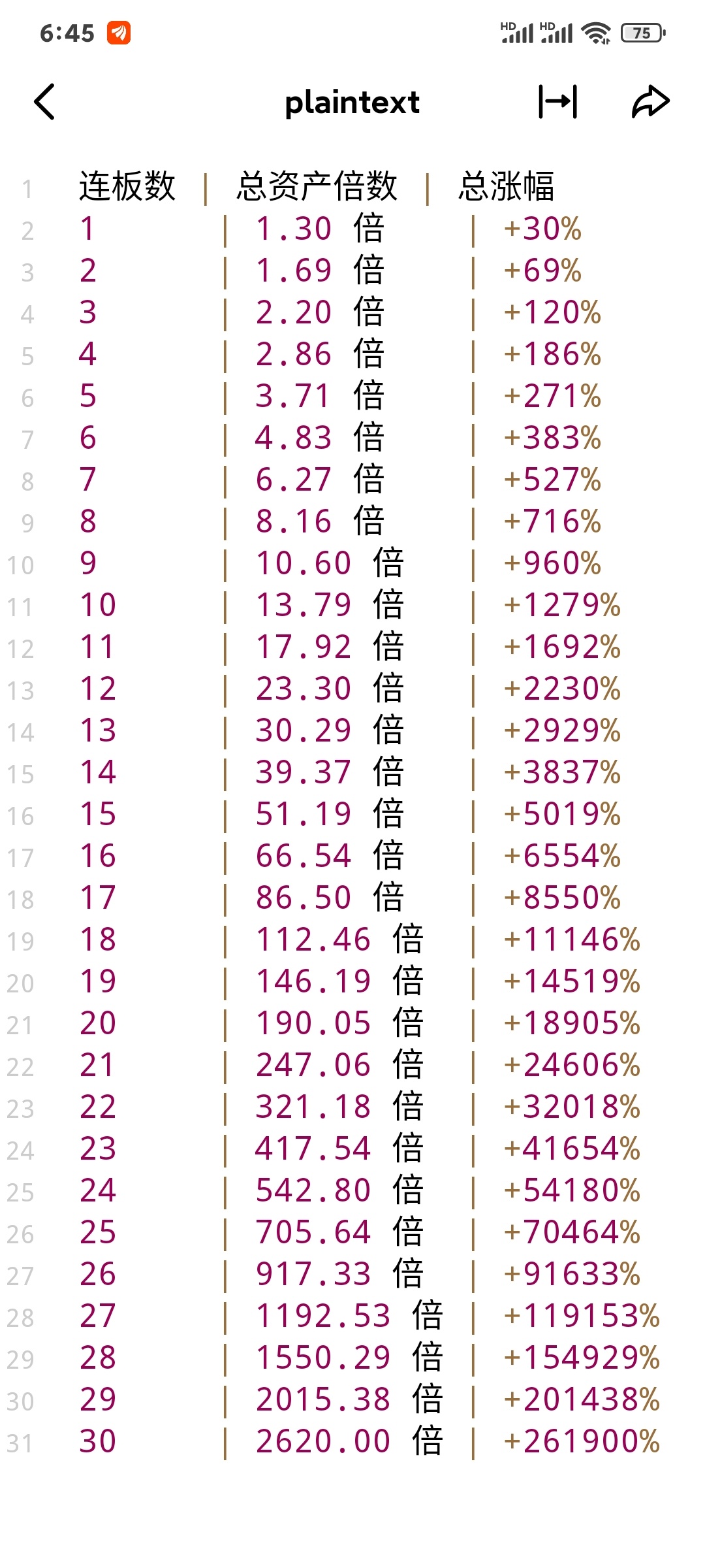 需要我顺便帮你算:10 板、15 板、20 板分别是多少倍,做个连板涨幅速查表吗?