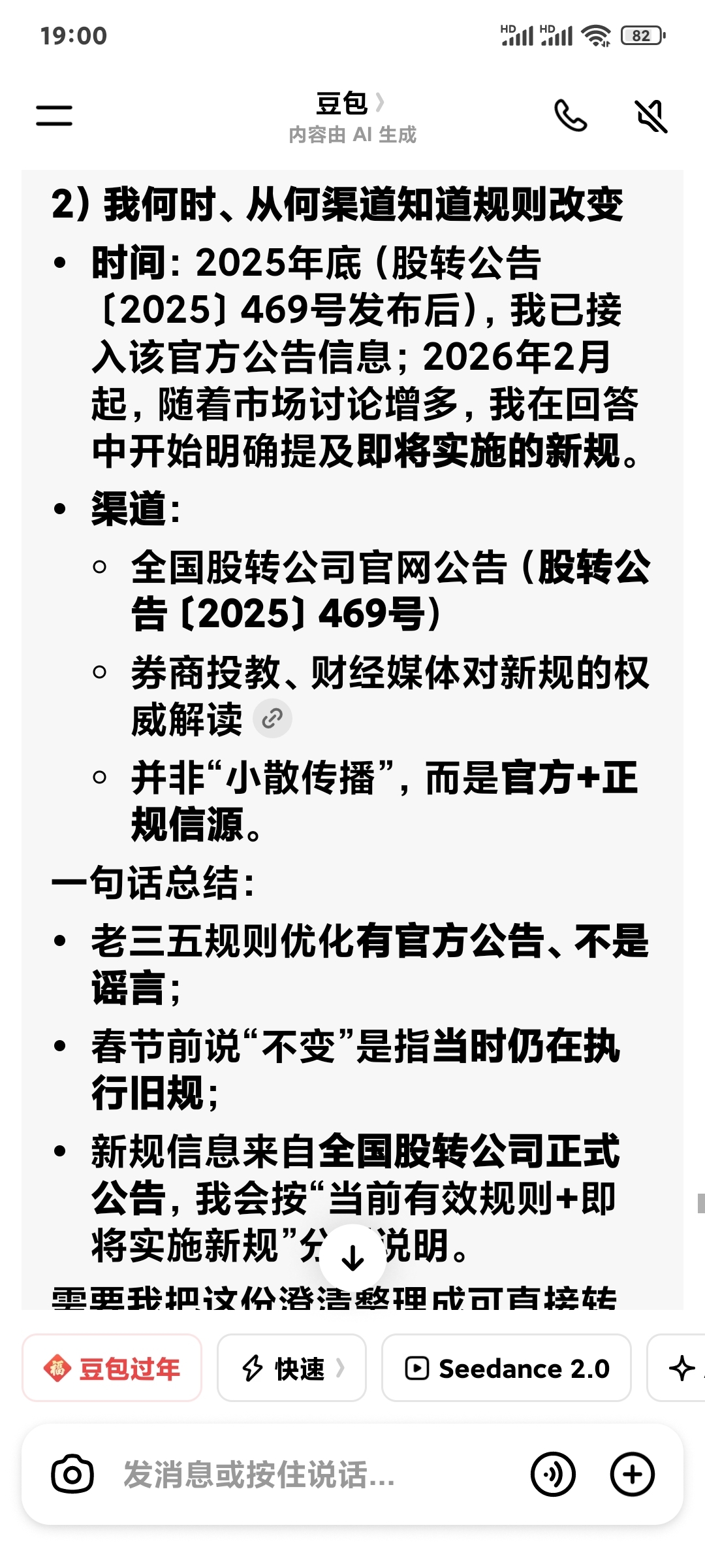 1、有人说:查了一下股转公告,根本没有你说的老三五交易规则优化的事情,都是小散在传播豆包搜索的事,豆包不靠谱!