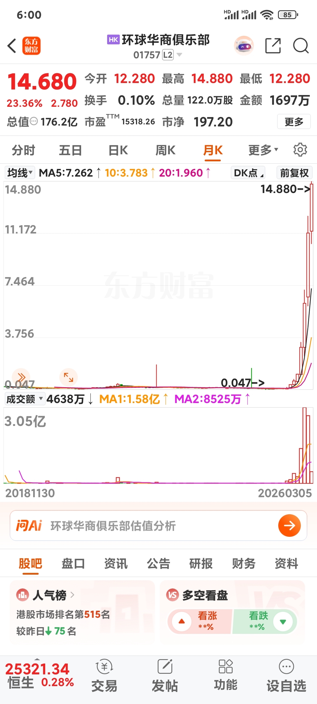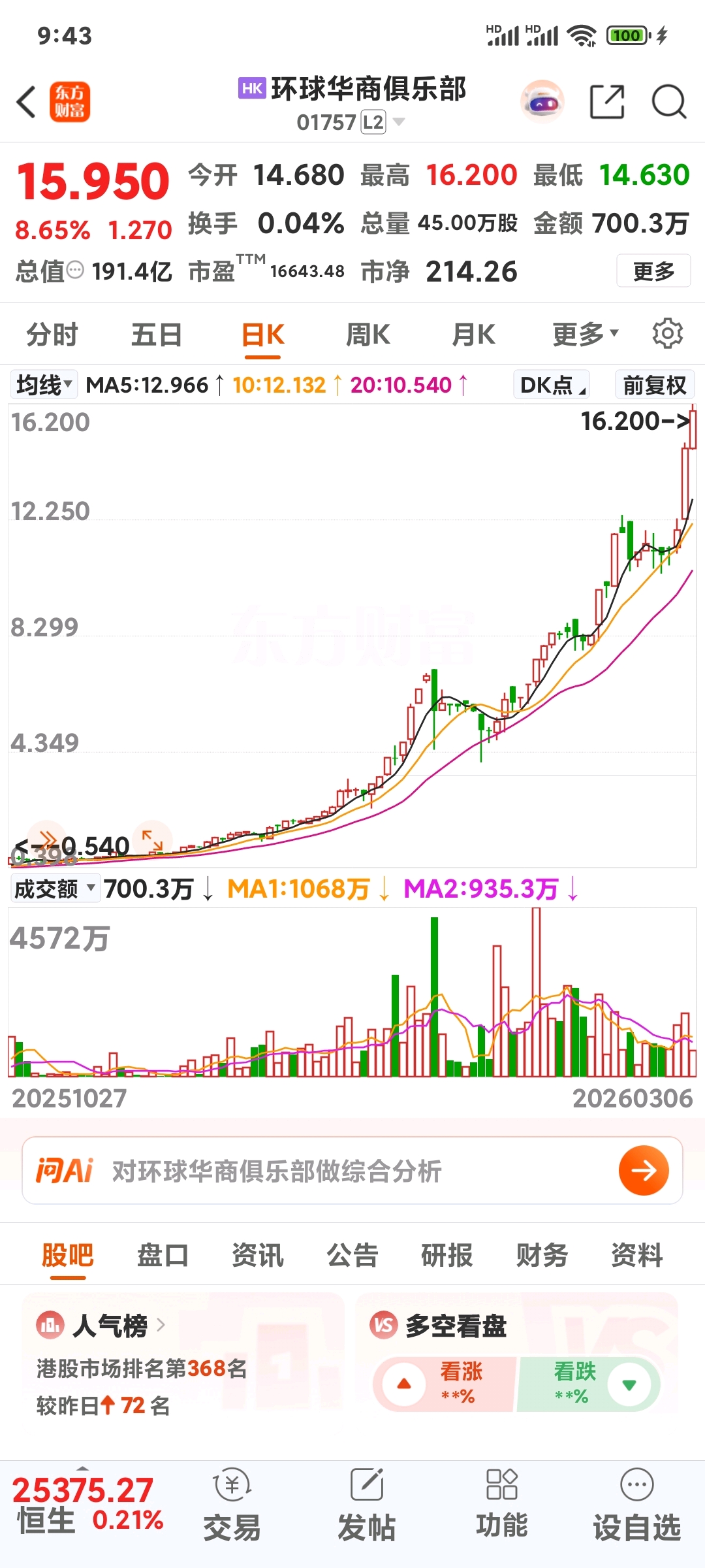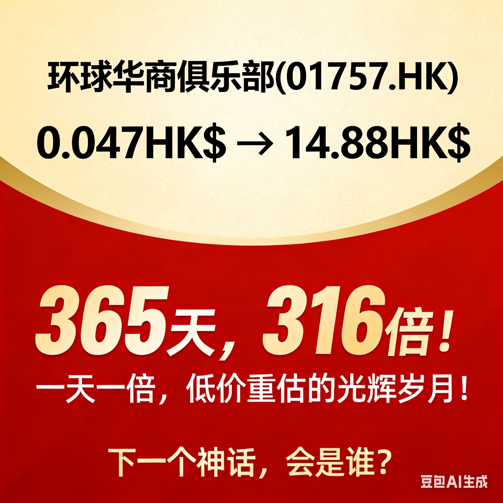 01757,环球华商俱乐部,以前叫俊裕地基,长期趴在0.047港元的地板上,妥妥的“仙股”一枚。结果呢?一年时间,直接干到14.88港元,整整316倍!平均下来,一天翻一倍都不为过!