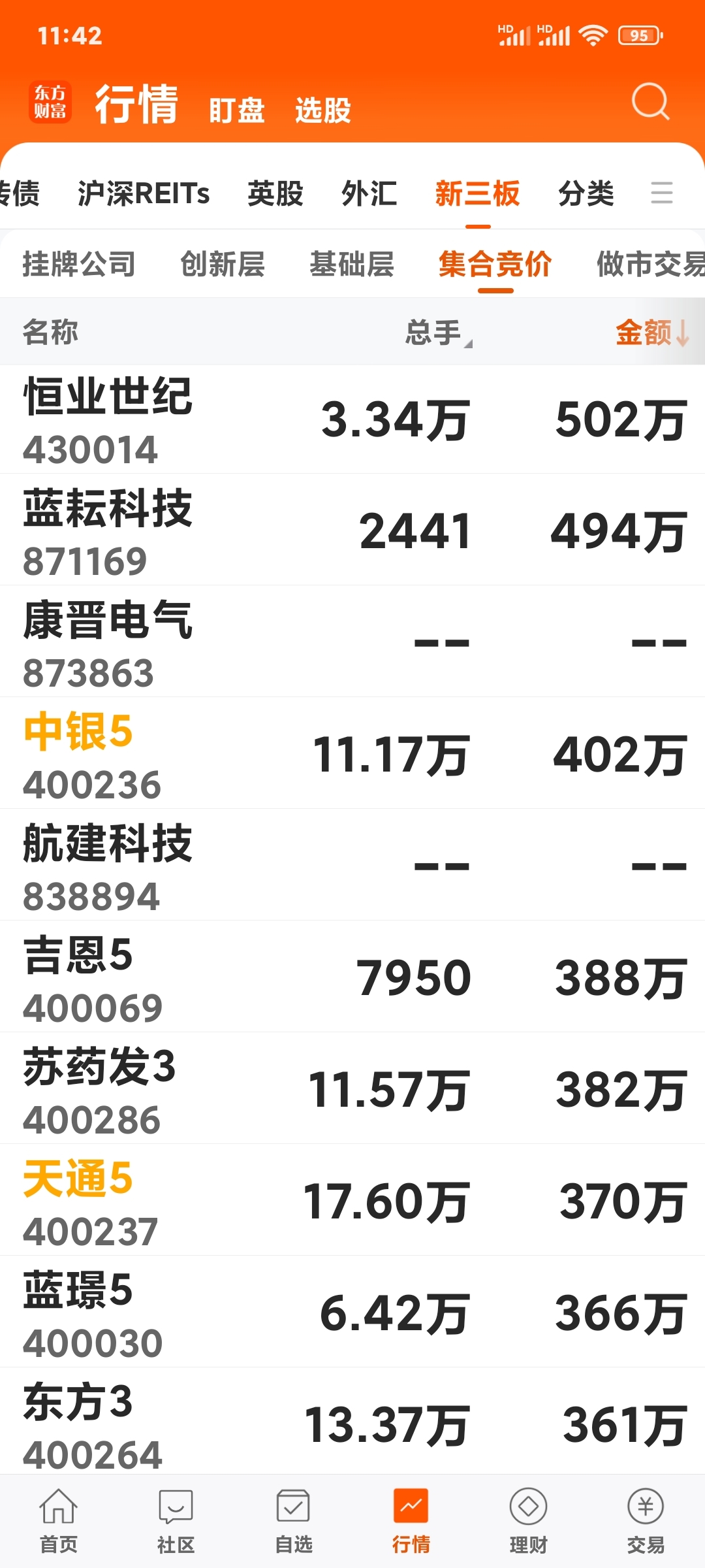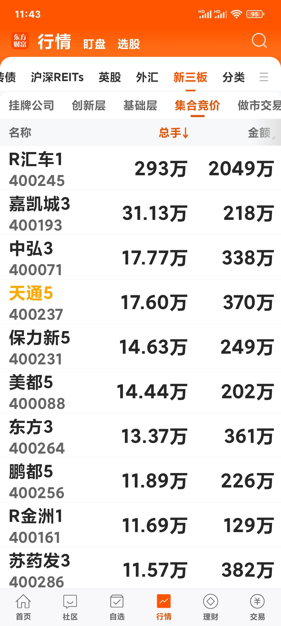 - 总手数:在“集合竞价”板块中,天通5以17.60万手的总手数排名第3,仅次于R汇车1和中弘3,说明筹码换手充分,交易活跃度远超多数老三板股票。
