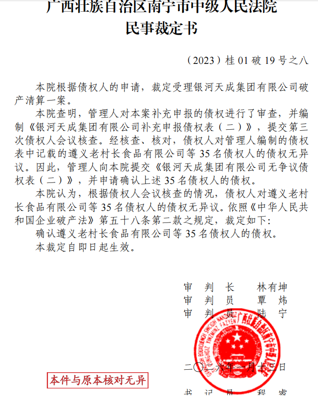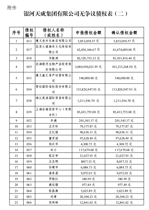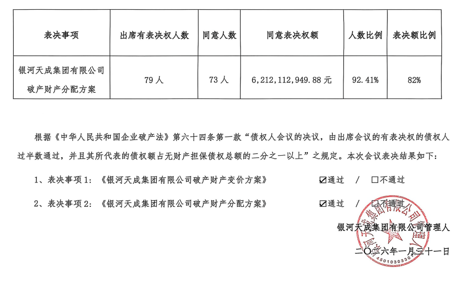 通过《银河天成集团有限公司破产财产分配方案》。债权表还是没有贵天成的