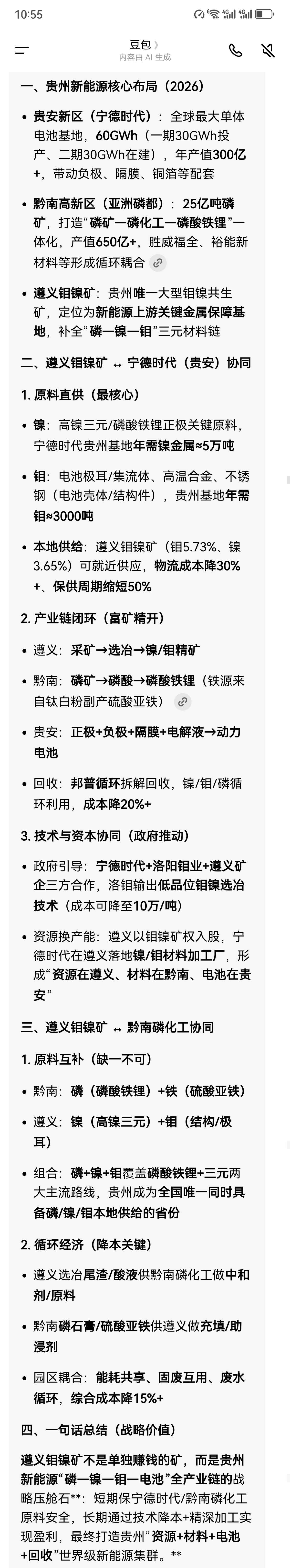 $贵天成3(SZ400238)$ 遵义钼镍矿是贵州新能源全链的“战略压舱石”,与黔南磷矿、宁德时代形成“磷—镍—钼—电池—回收”闭环,短期保供降本,长期技术盈利,最终打造全国唯一具备磷镍钼本地供给的世界级新能源基地。