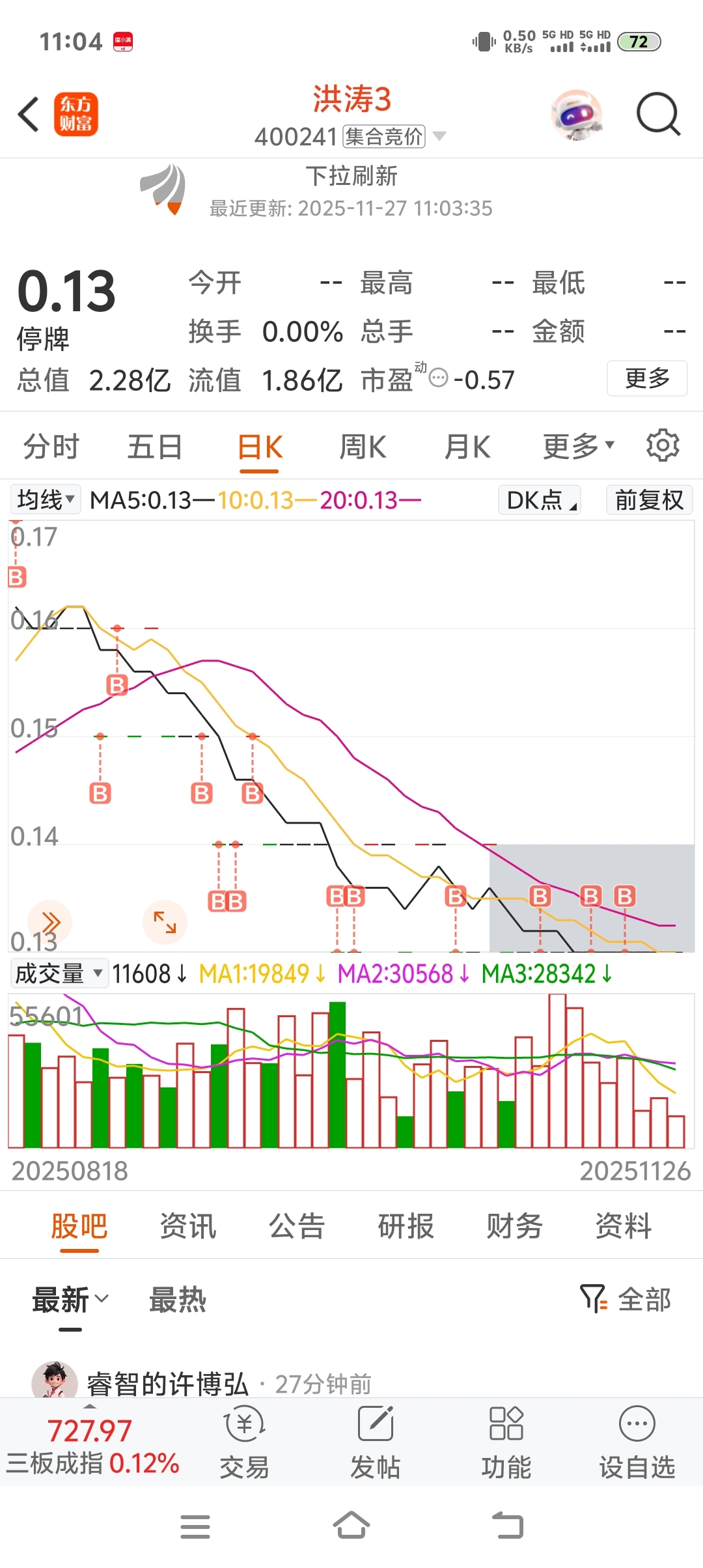 $洪涛3(SZ400241)$ 三哥已经3个交易日没买洪涛了,但是洪涛3在0.13元的卖盘明显逐渐枯竭,成交量已到了地量见地价的局势!