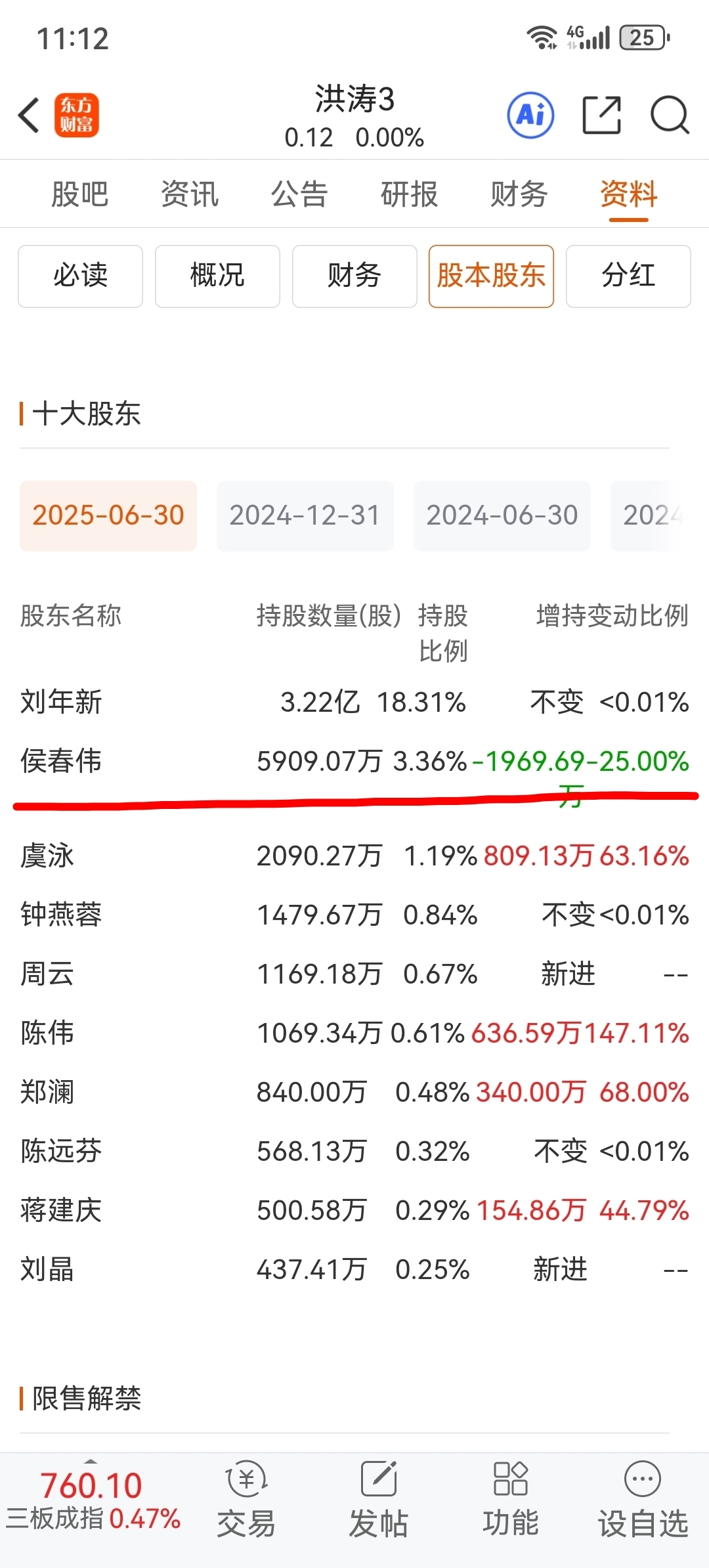 $洪涛3(SZ400241)$ 十大股东,只有侯春伟一人减持。有点意思哈,什么价位了还减持?就那么缺钱吗?不觉得自己是在贱卖自己的股权?谁与钱有仇?