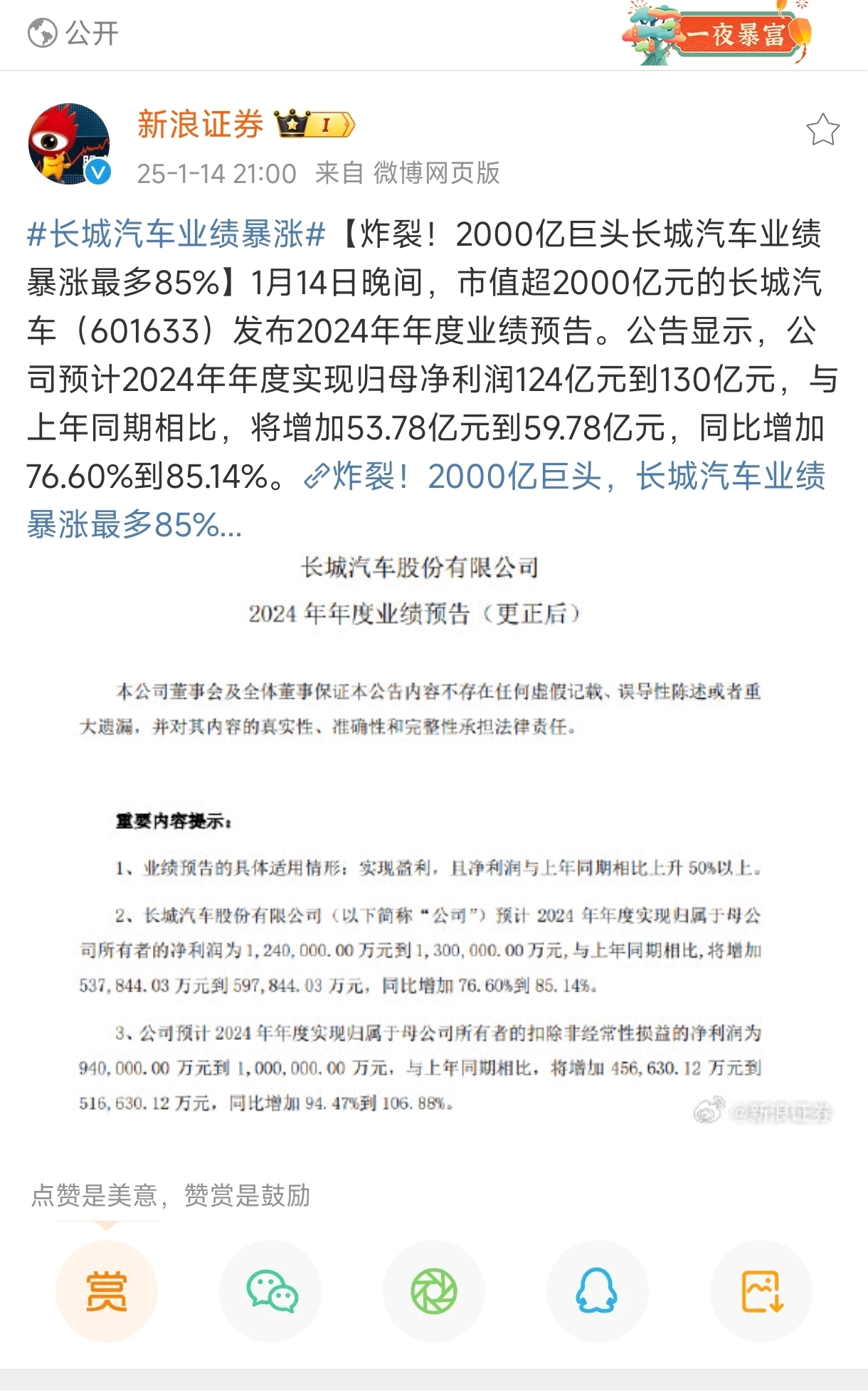 $汇车5(SZ400245)$ 长城汽车业绩暴涨