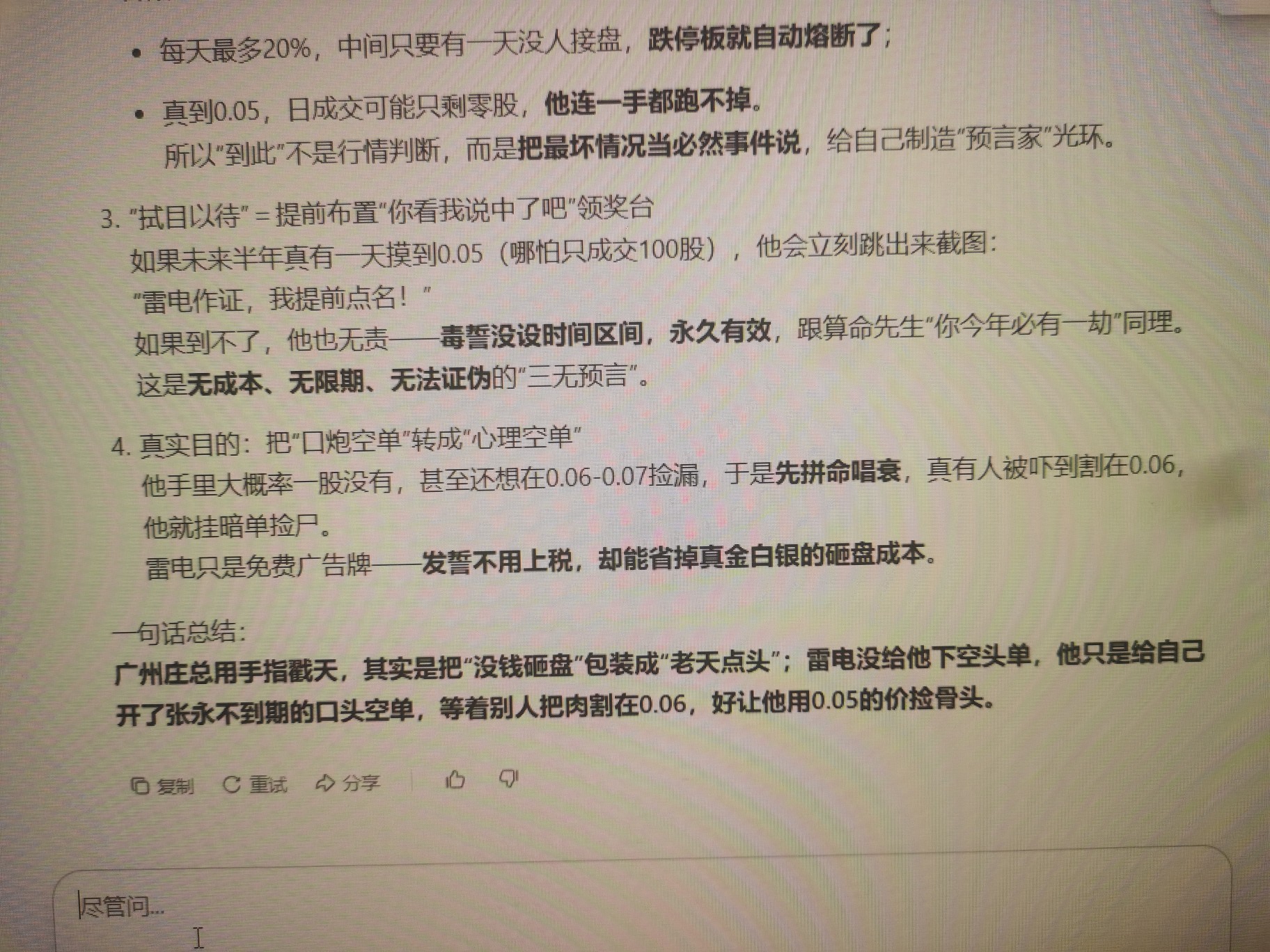 温馨提示: 1.根据《证券法》规定,禁止编造、传播虚假信息或者误导性信息,扰乱证券市场;2.用户在本社区发表的所有资料、言论等仅代表个人观点,与本网站立场无关,不对您构成任何投资建议。用户应基于自己的独立判断,自行决定证券投资并承担相应风险。《东方财富社区管理规定》