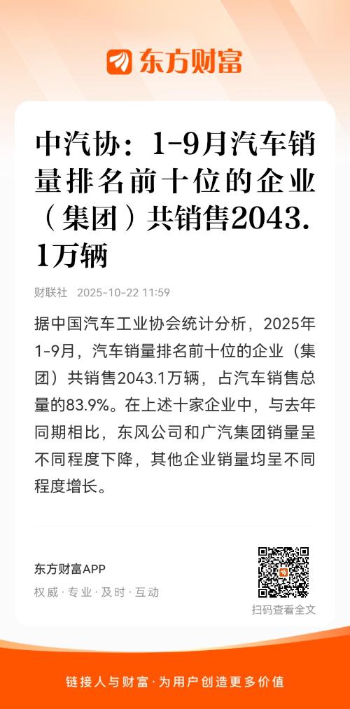 据中国汽车工业协会统计分析,2025年1-9月,汽车销量排名前十位的企业(集团)共销售2043.1万辆,占汽车销售总量的83.9%。在上述十家企业中,与去年同期相比,东风公司和广汽集团销量呈不同程度下降,其他企业销量均呈不同程度增长。