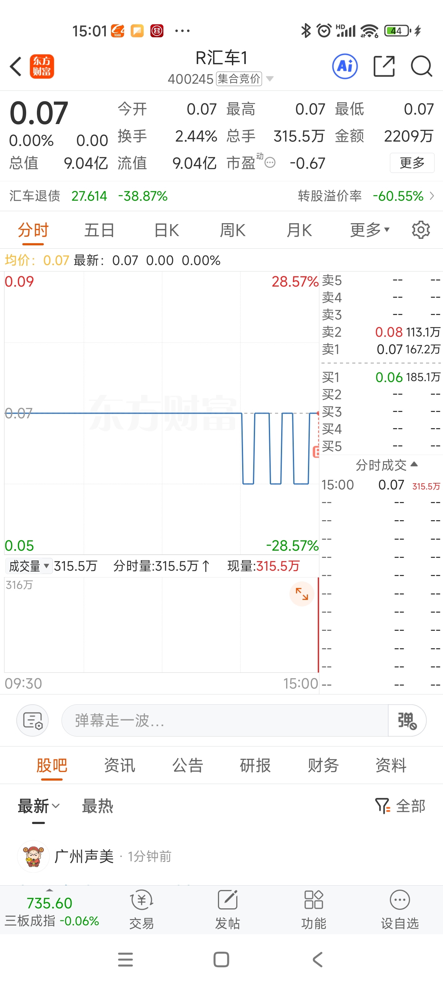 $R汇车1(SZ400245)$ 0.07元买入二万元