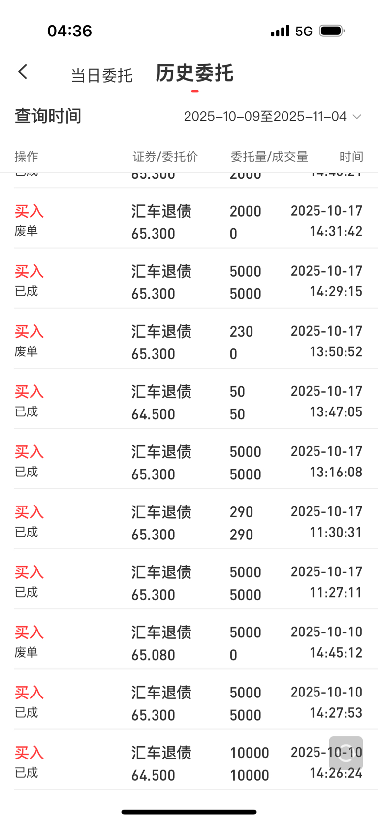 $R汇车1(SZ400245)$ $汇车退债(SZ404004)$ 广汇汽车公司11月3日晚公告公司将以现金收购可转债持有人持有的全部或者部分汇车退债,股票和汇车退债即日开始停盘,等收购完成后再复盘,本人粗略计算,大概收购价格为票面+当年利息即100+80/365*2%=100.44元,这个价格,大多数汇车债持有人应该是获利的,也是可以接受并认可的价格,本人以前多次分析过汇车公司现金收购汇车退债的可能性及必要性,大家可以看我以前的帖子。 具体到操作,本人计划持有的汇车债大部分按100.44卖给汇车公司,小部分转股,得到的资金等汇车股复盘之日按涨停价8分委托买入,下一个交易日按9分买入,第三个交易日按1毛买人,这样还有平均10个点的套利空间。 另外,汇车债复盘后本人计划再收汇车债1万张,价格90元(对应汇车股9分的价格),我股东号0375606616,席位号728120,约定号666888(或者您定),委托后截图给我