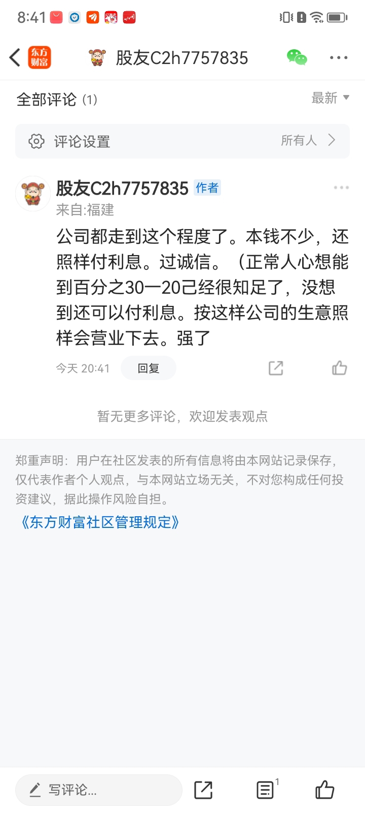 温馨提示: 1.根据《证券法》规定,禁止编造、传播虚假信息或者误导性信息,扰乱证券市场;2.用户在本社区发表的所有资料、言论等仅代表个人观点,与本网站立场无关,不对您构成任何投资建议。用户应基于自己的独立判断,自行决定证券投资并承担相应风险。《东方财富社区管理规定》