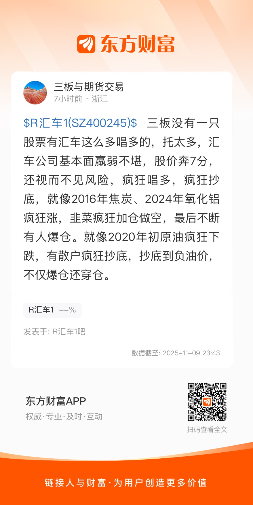 $R汇车1(SZ400245)$ 三板没有一只股票有汇车这么多唱多的,托太多,汇车公司基本面羸弱不堪,股价奔7分,还视而不见风险,疯狂唱多,疯狂抄底,就像2016年焦炭、2024年氧化铝疯狂涨,韭菜疯狂加仓做空,最后不断有人爆仓。就像2020年初原油疯狂下跌,有散户疯狂抄底,抄底到负油价,不仅爆仓还穿仓。
