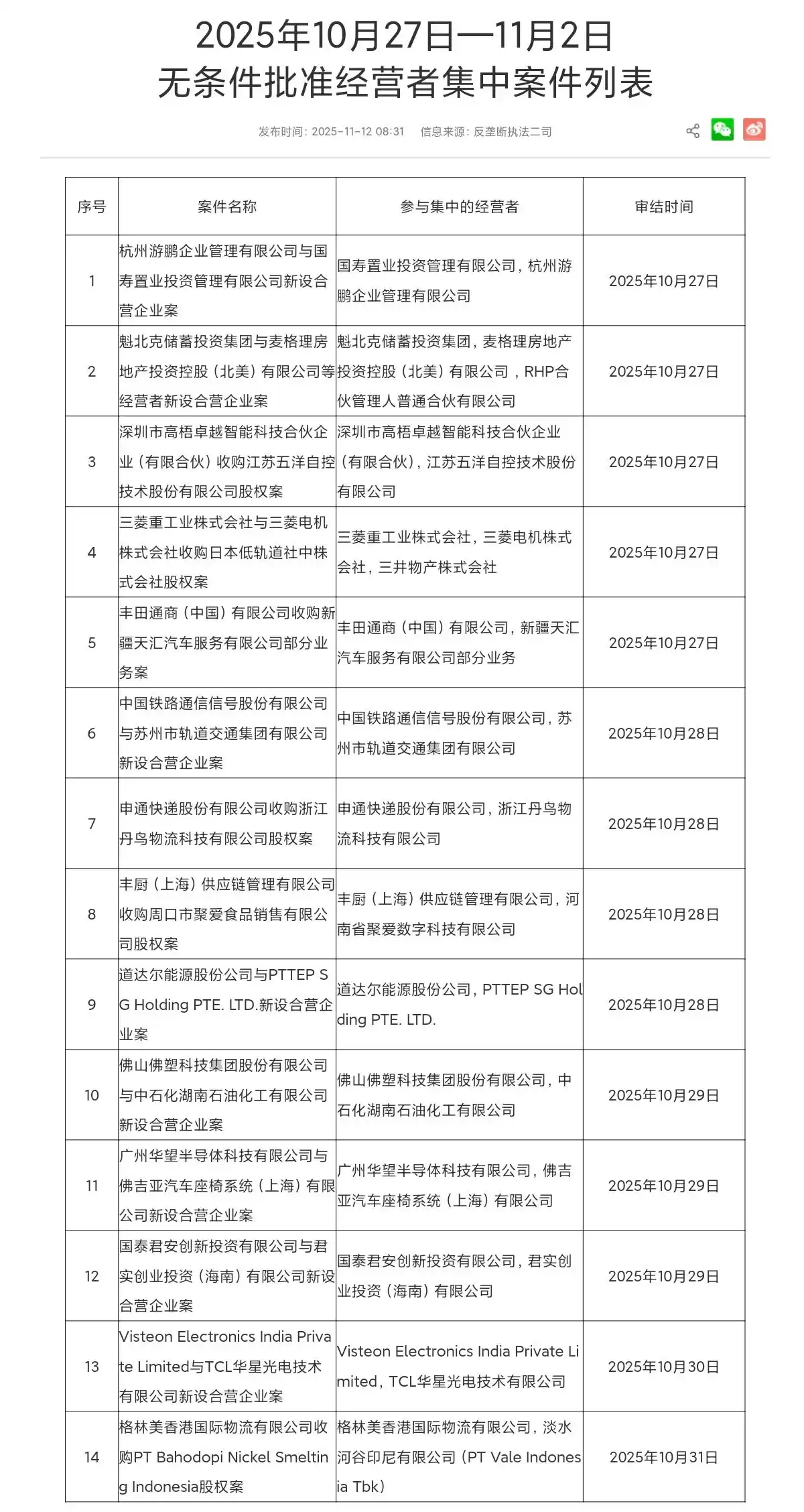 【市场监管总局无条件批准丰田通商收购天汇汽车部分业务案】11月12日,市场监管总局网站发布2025年10月27日—11月2日无条件批准经营者集中案件列表,其中包括丰田通商(中国)有限公司收购新疆天汇汽车服务有限公司部分业务案、申通快递股份有限公司收购浙江丹鸟物流科技有限公司股权案等。