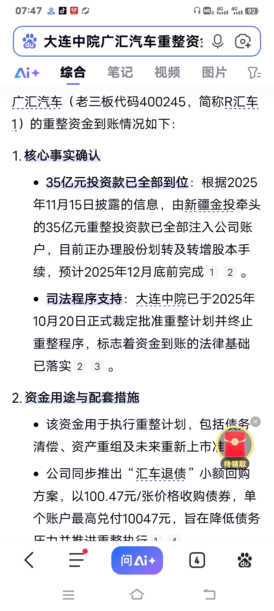 $R汇车1(SZ400245)$ 我一直认为新疆金投35亿到帐广汇汽车一事认为是假的,我今天也就是刚刚查了百度大连中院得到了确认《见图》