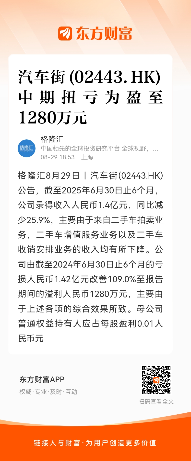 格隆汇8月29日丨汽车街(02443.HK)公告,截至2025年6月30日止6个月,公司录得收入人民币1.4亿元,同比减少25.9%,主要由于来自二手车拍卖业务,二手车增值服务业务以及二手车收销安排业务的收入均有所下降。公司由截至2024年6月30日止6个月的亏损人民币1.42亿元改善109.0%至报告期间的溢利人民币1280万元,主要由于上述各项的综合效果所致。母公司普通权益持有人应占每股盈利0.01人民币元