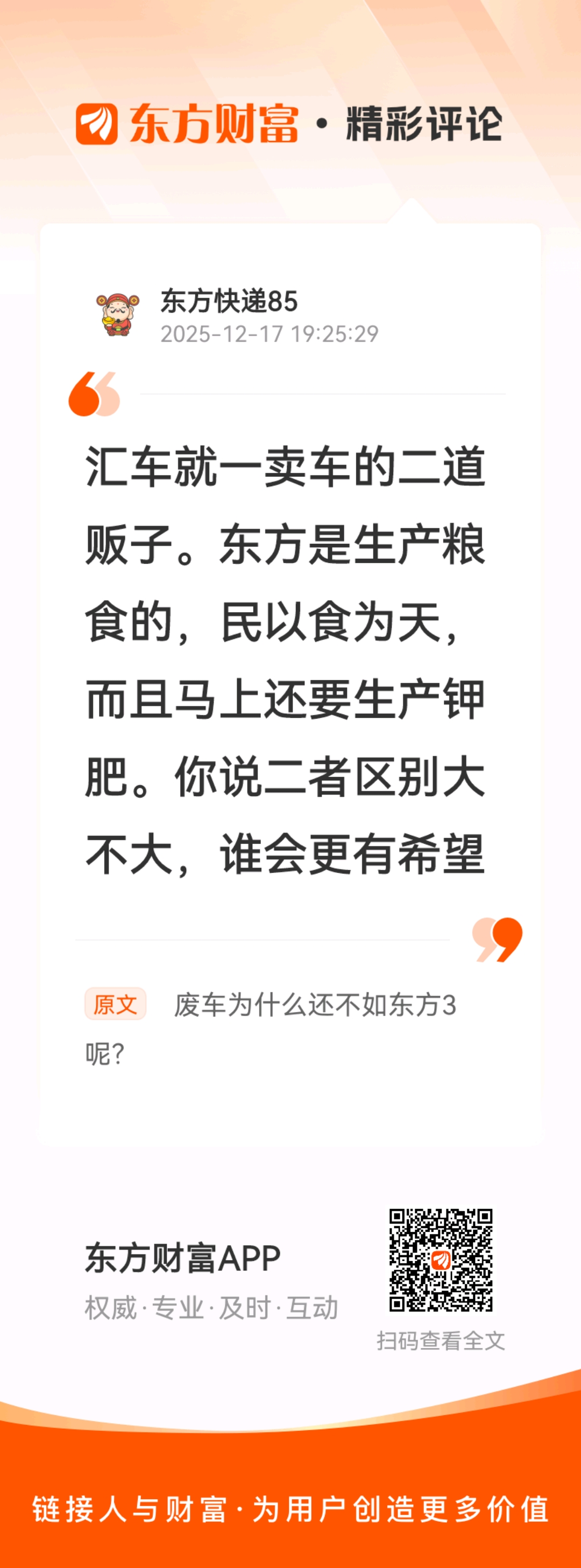 //@东方快递85 :汇车就一卖车的二道贩子。东方是生产粮食的,民以食为天,而且马上还要生产钾肥。你说二者区别大不大,谁会更有希望