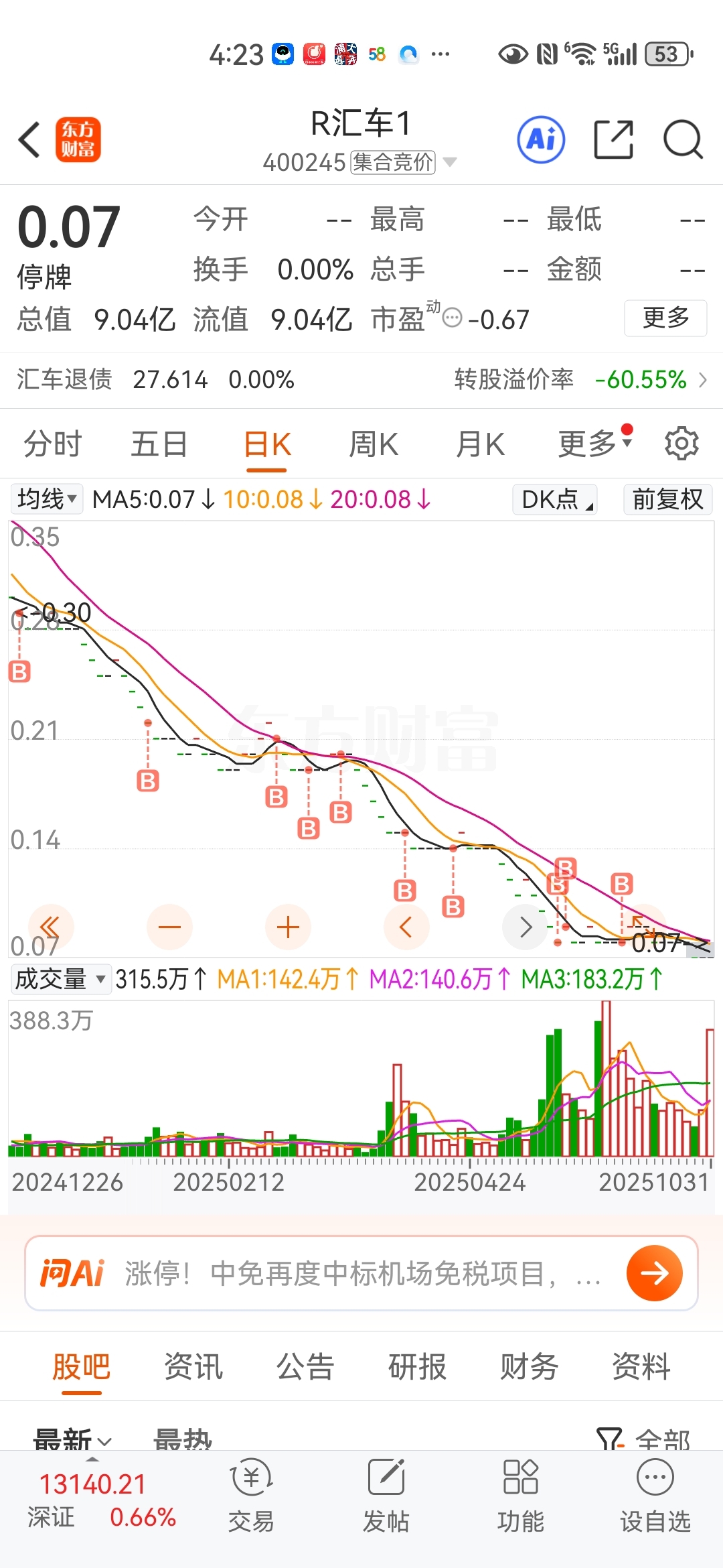 $R汇车1(SZ400245)$ 7分的时候,家里装修,眼睁睁的看着别人买,兜里没钱了,感觉错失了人生唯一发财的机会