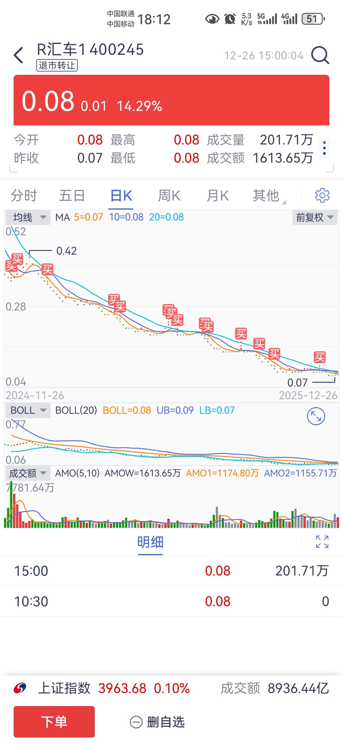 $R汇车1(SZ400245)$ 都0.08元了,要有自己的判断能力,玩三板都有准备清零的结果,没有任何人能分析研究透股市,别听哪些的,要知道退市0.78元跌下来的,每个交易日的成交额是千万元以上,自己统计一下,退市到现在成交额是多少,最坏的结果就是清零吗?跌就补点仓,一定不要全干,跌就加仓,我的目标是为了重组上市,只买不卖,别喷我,个人观点