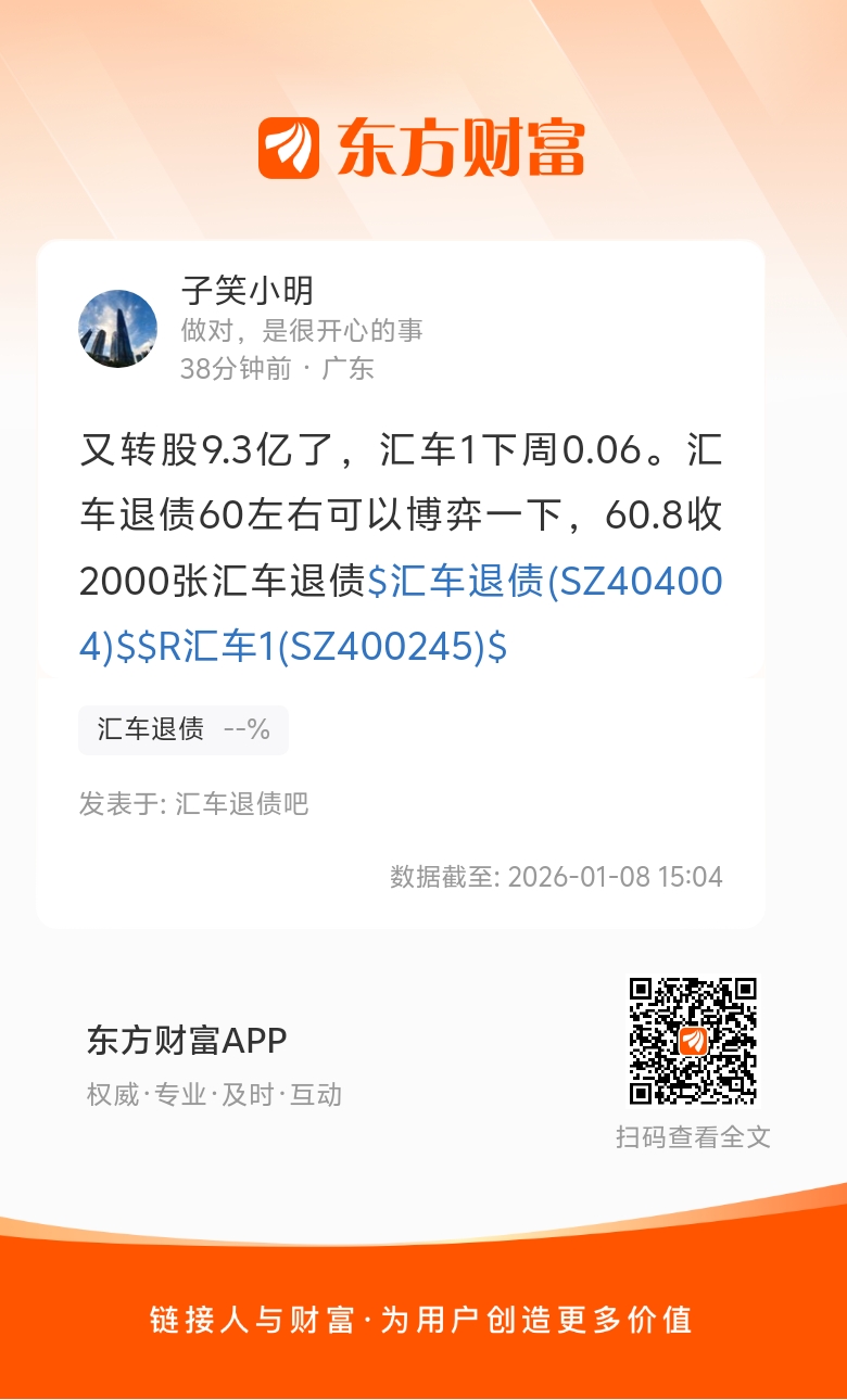 又转股9.3亿了,汇车1下周0.06。汇车退债60左右可以博弈一下,60.8收2000张汇车退债$汇车退债(SZ404004)$$R汇车1(SZ400245)$