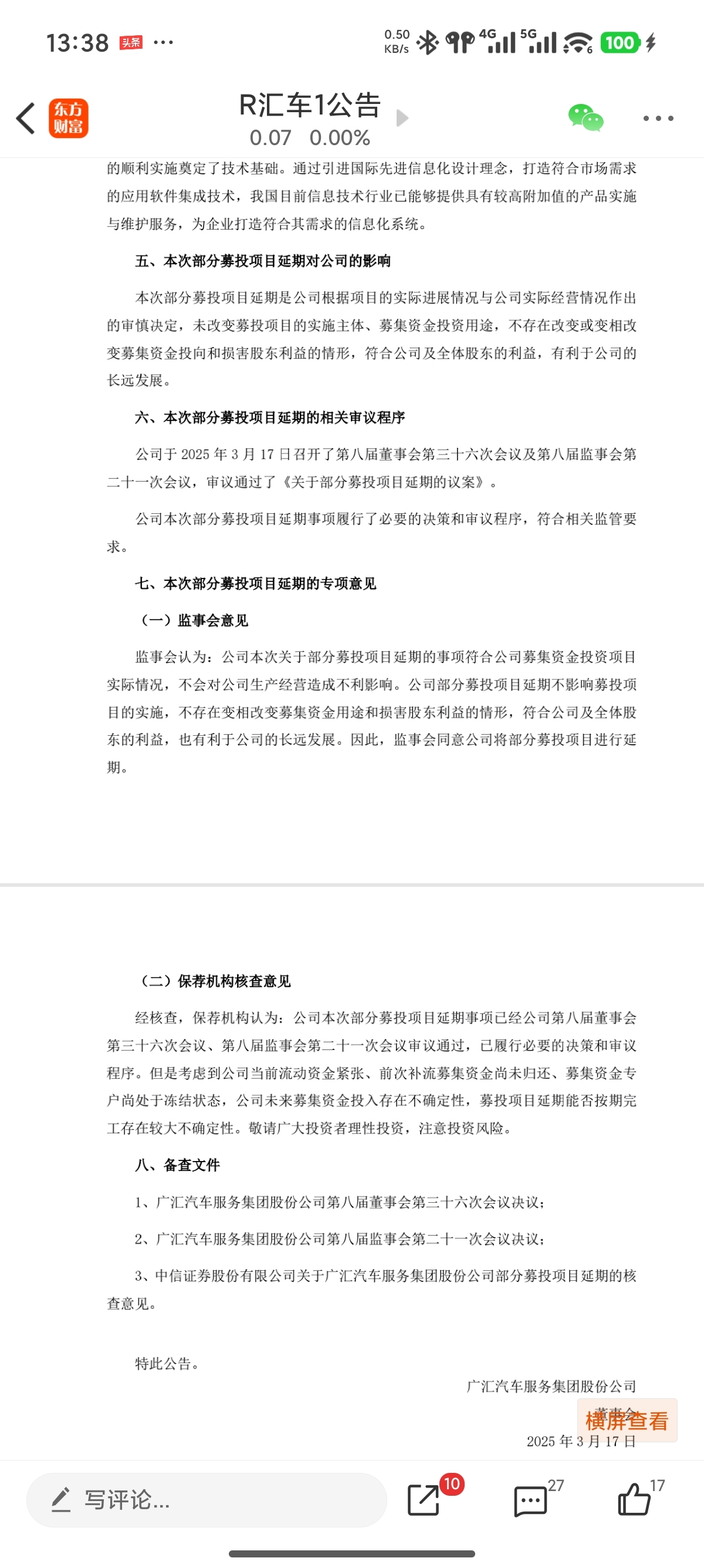 看之前的公告,公司的领导层还是认为有必要继续完成募集项目,可是前段时间你都说了要以出租为主,那为什么还要占用被挪走的募集资金?自相矛盾,而且最恶心的是这个募集资金的使用期限被延期到可转债到期前一天,我想说,你这是什么用意?真打算一直化债到最后一天?然后最后一天还拿的人直接给展期?与其这样,倒不如大大方方站稳0.08,让大伙儿痛痛快快都走人呢。