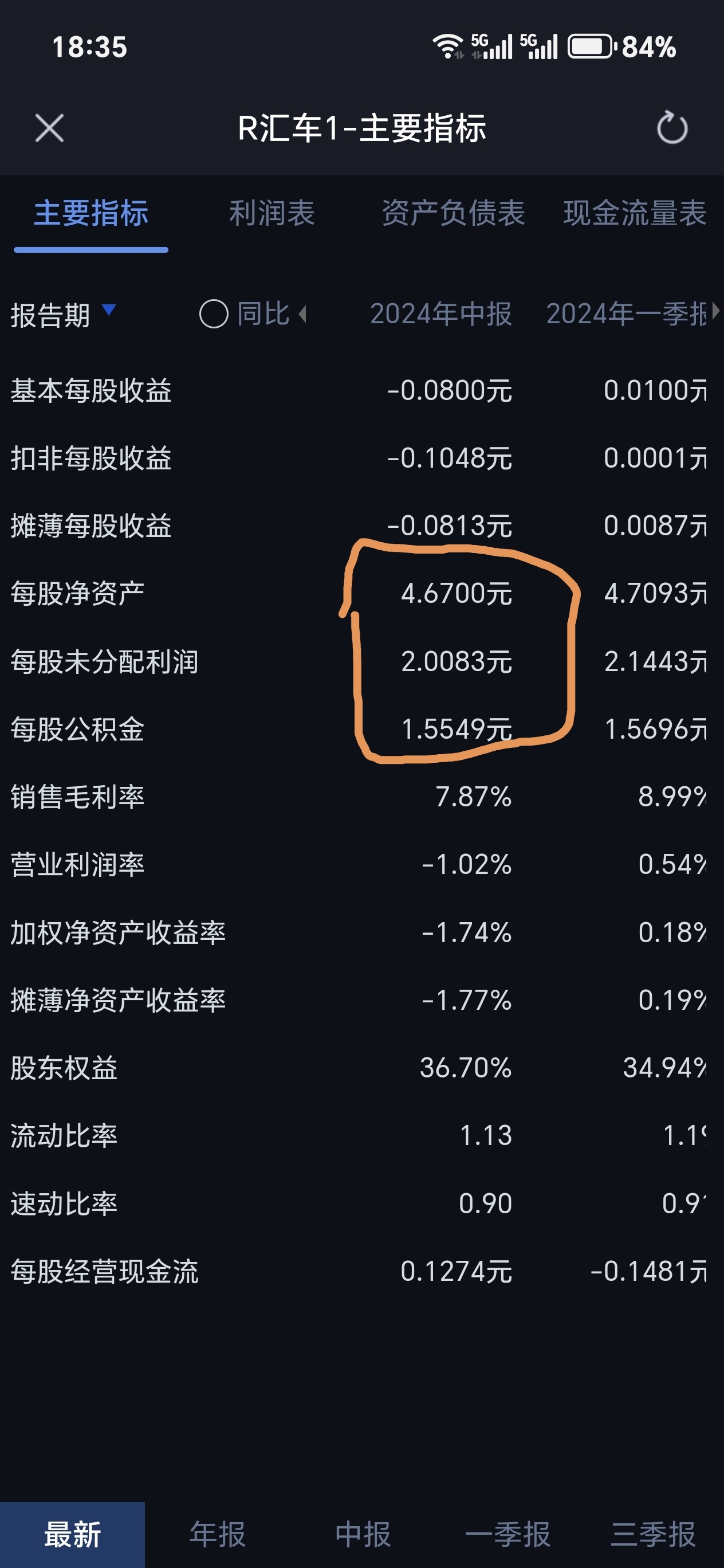 $R汇车1(SZ400245)$ 下图中的指标是汇车2024年中报的业绩数据,即使24年7月份至今不赚1分钱,门店全关了,汇车股价起码3元以上(当初给广汇门店老板及员工的原始股价是3.2元),现在7分8分买入者,就坐等数大洋吧