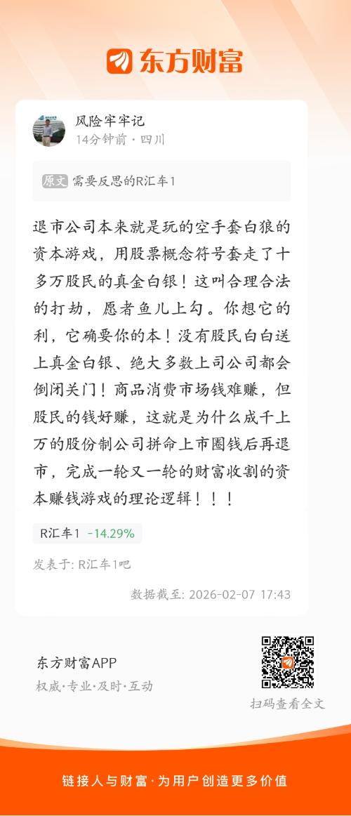 特别提醒://@风险牢牢记 :退市公司本来就是玩的空手套白狼的资本游戏,用股票概念符号套走了十多万股民的真金白银!这叫合理合法的打劫,愿者鱼儿上勾。你想它的利,它确要你的本!没有股民白白送上真金白银、绝大多数上司公司都会倒闭关门!商品消费市场钱难赚,但股民的钱好赚,这就是为什么成千上万的股份制公司拼命上市圈钱后再退市,完成一轮又一轮的财富收割的资本赚钱游戏的理论逻辑!!!