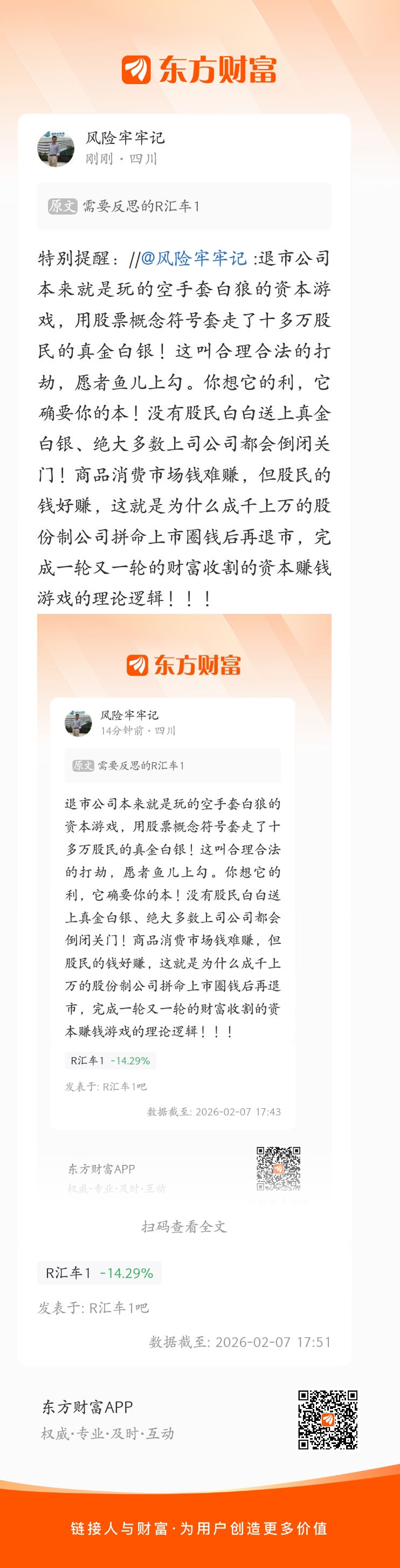 //@风险牢牢记 :特别提醒://@风险牢牢记 :退市公司本来就是玩的空手套白狼的资本游戏,用股票概念符号套走了十多万股民的真金白银!这叫合理合法的打劫,愿者鱼儿上勾。你想它的利,它确要你的本!没有股民白白送上真金白银、绝大多数上司公司都会倒闭关门!商品消费市场钱难赚,但股民的钱好赚,这就是为什么成千上万的股份制公司拼命上市圈钱后再退市,完成一轮又一轮的财富收割的资本赚钱游戏的理论逻辑!!!