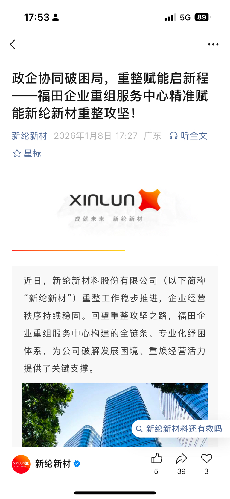 $新纶3(SZ400246)$ 政府大力支持协助新纶重整
