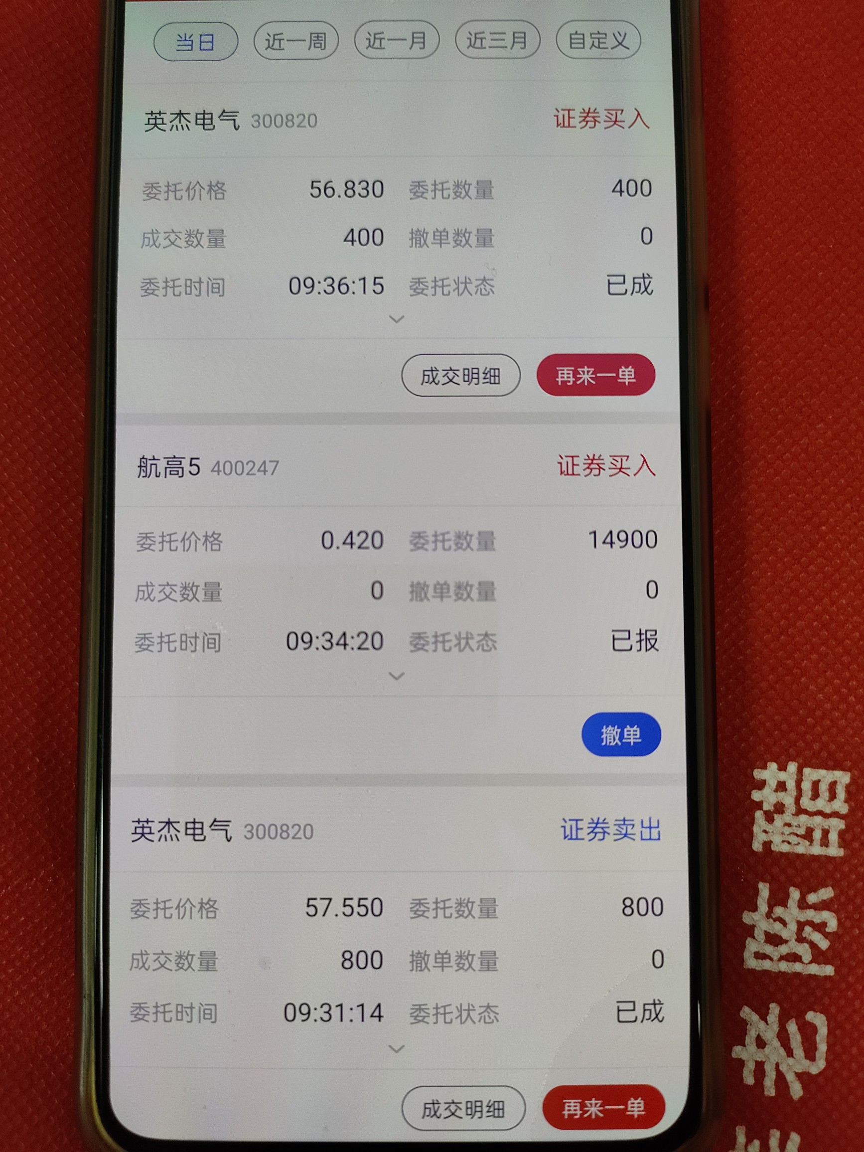 挂了两个买单,成交了一单,另一单未成交。英杰电气,成功做T,持仓时间4个交易日,