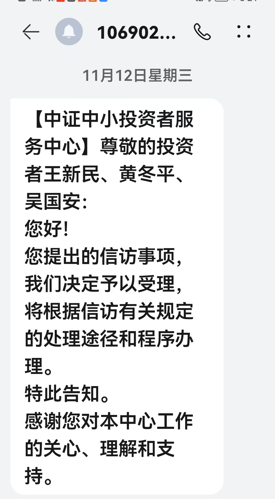 由中国证监会11月5日交办上海中证中小投资者服务中心的,海印股份股民集体诉讼三位代表人,王新民 黄冬平 吴国安的要求《中小投务必介入海印股民集体诉讼的报告》,11月12日上海中小投服务中心已经正式受理。