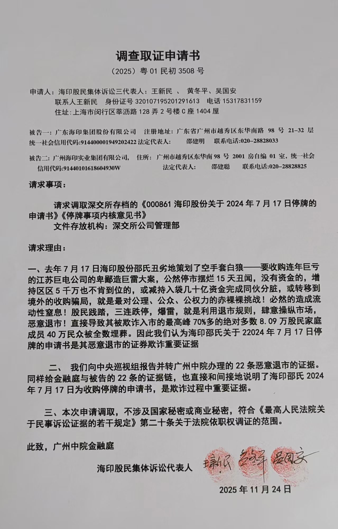 《海印股民集体诉讼》调查取证申请书(目前,还没有收到结果的申请书)