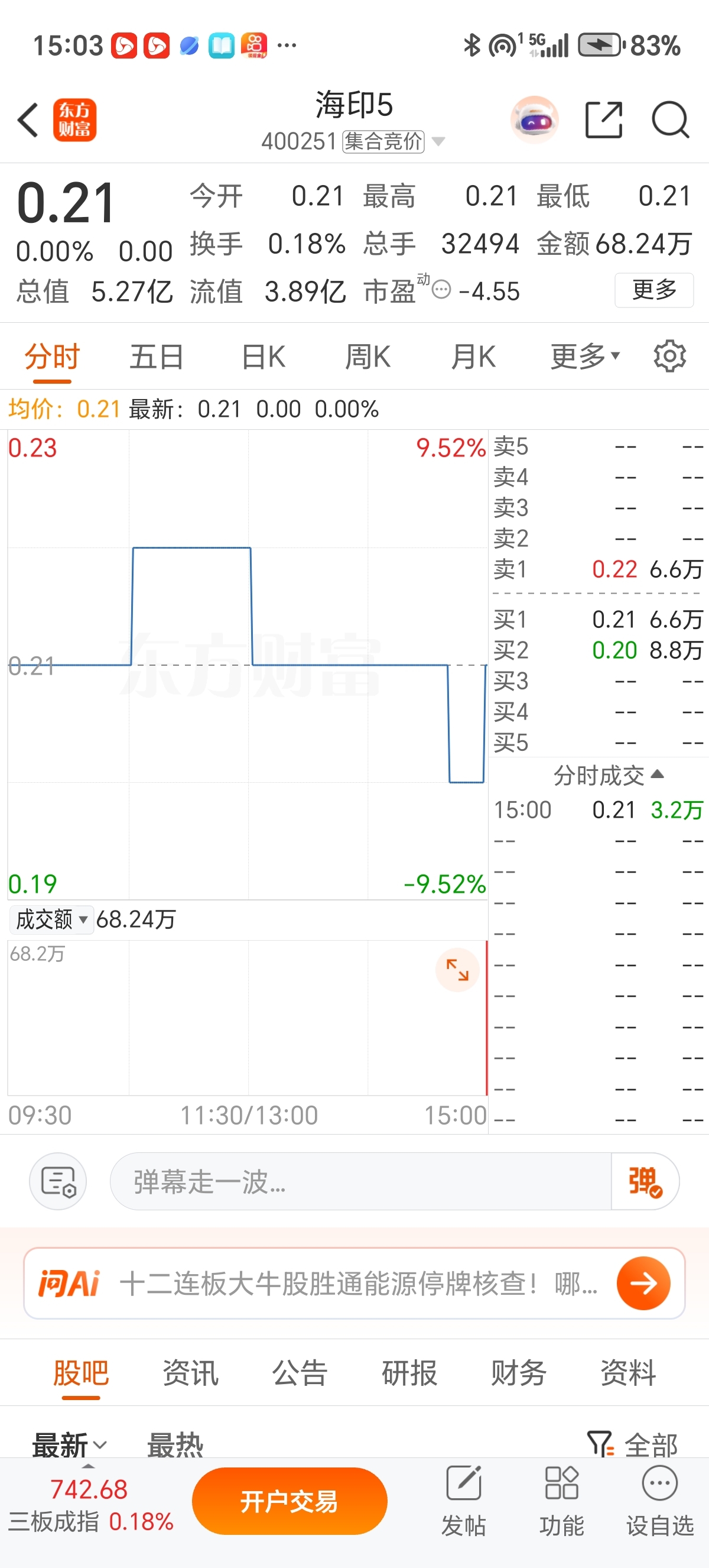 什么意思?昨天收盘0.21买盘还有8万多手,今天至少也应该是平盘,结果非要砸个跌停来恐吓一下,这是干嘛呢?