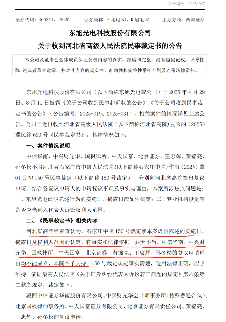 R旭电A1:关于收到河北省高级人民法院民事裁定书的公告走虚假陈述诉讼进度就是快,