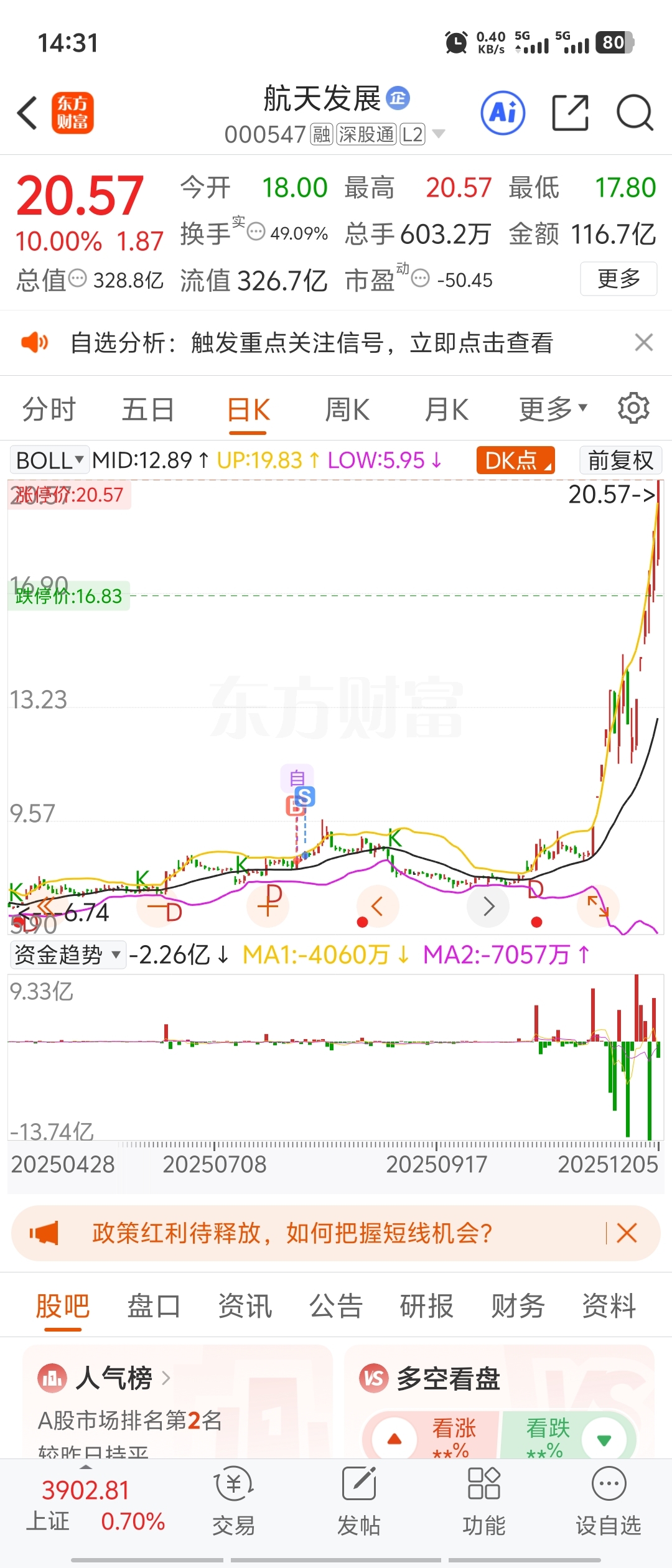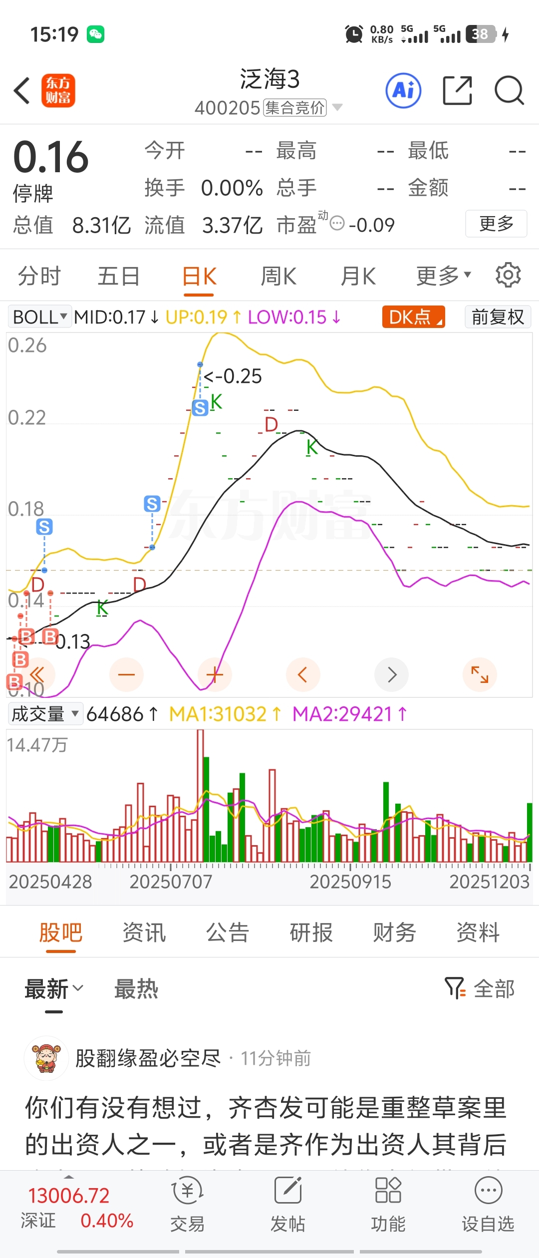 $鹏都5(SZ400256)$ 预测今天缩量。今天买的多少预测不到。卖绝对超不过50万, 顶破天3万手,不信一会就知道了。感谢泛海让我翻倍。鹏都没有五倍我是不会走的。$泛海3(SZ400205)$ 错过了太多了。是我格局小了。必须干龙头。约涨约拿住。