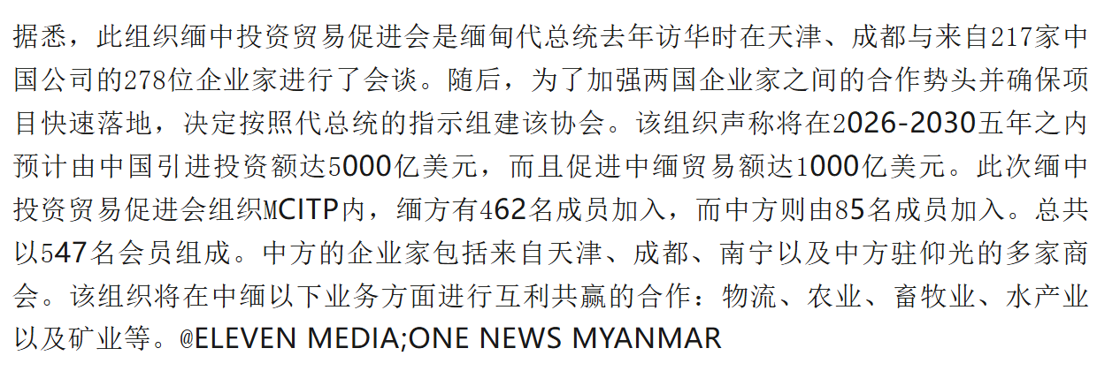 2026年1月31日仰光讯。1月31日昨天下午在仰光HEXAGON COMPLEX大厅隆重举行“MYANMAR CHINA INVESTMENT AND TRADE PROMOTION ASSOCIATION -MCITP缅中投资贸易促进会”成立大会暨首次联席大会。