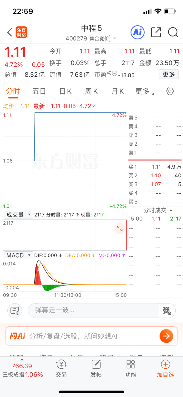 没人买,缩量,理论上100万都可4.5个板