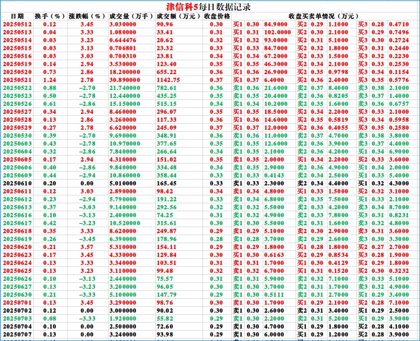 $津信科5(SZ400259)$ 20251124收盘后统计的津信科5历史数据(含当天)。希望对朋友们分析有帮助。津信科5和东方3是我唯一持有的两支老三板股票,不买也不卖,长期持有。带着津信科5和东方3一直到2030!祝股友们股市长红!