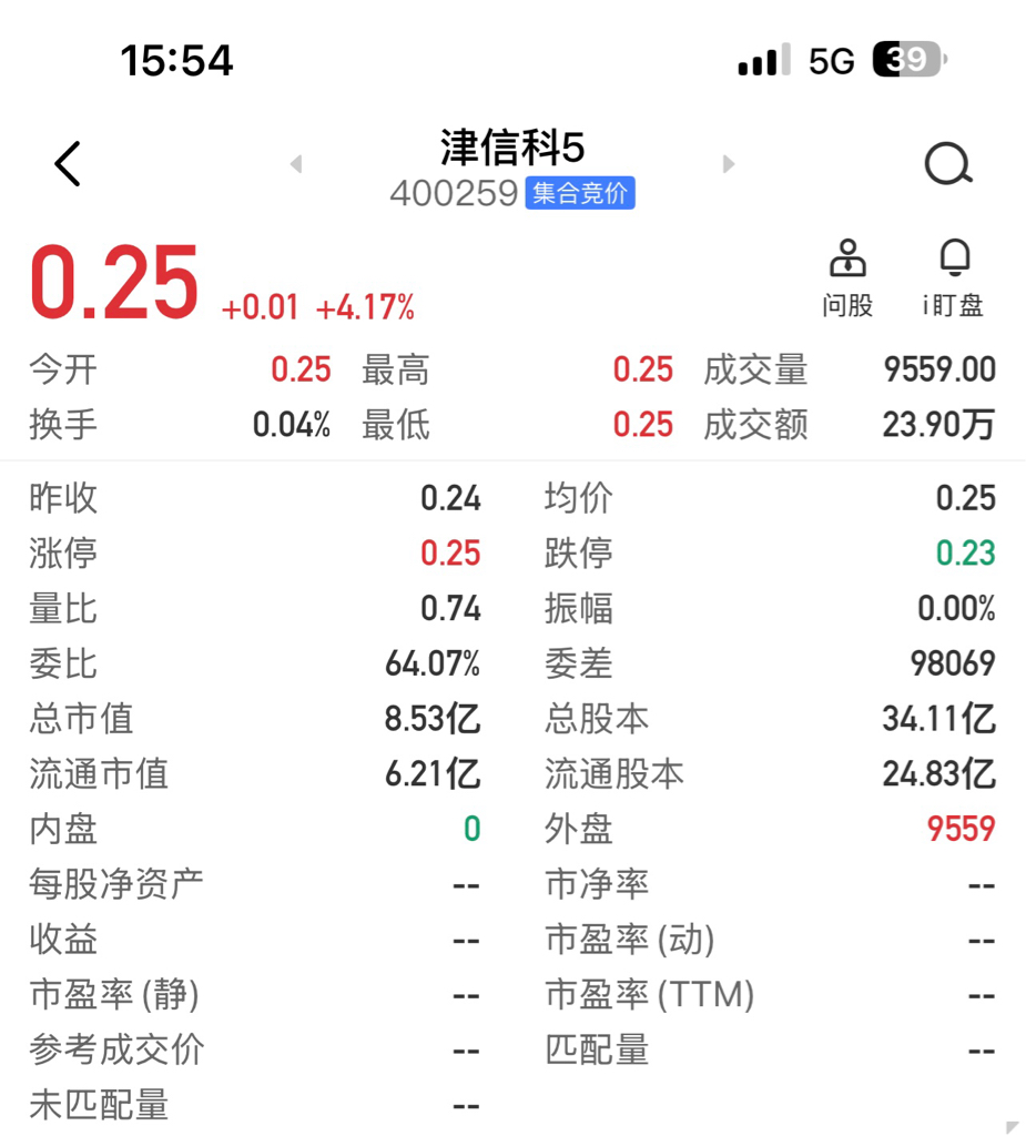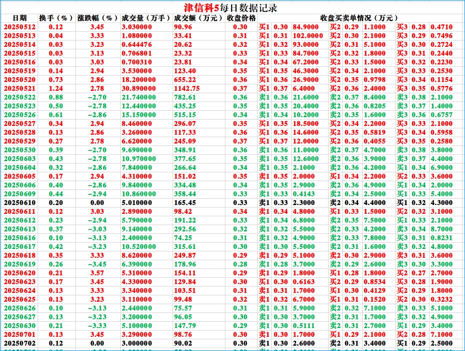 $津信科5(SZ400259)$ 津信科5的第183个交易日。20260203收盘后统计的津信科5历史数据(含当天)。希望对朋友们分析有帮助。津信科5和东方3是我唯一持有的两支老三板股票,不买也不卖,长期持有。带着津信科5和东方3一直到2030!祝股友们手中股票长红赚大钱!