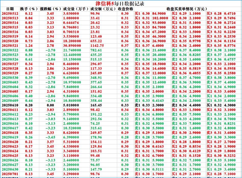 津信科5的第190个交易日。20260212收盘后统计的津信科5历史数据(含当天
