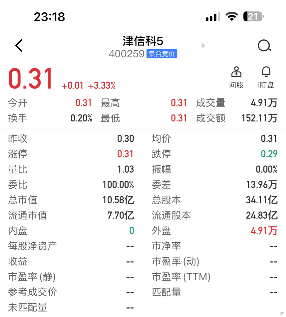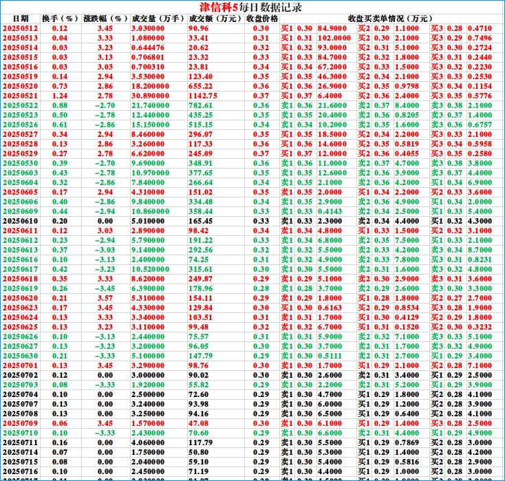 $津信科5(SZ400259)$ 终于又开始赚钱了,希望能连板到劳动节。津信科5的第196个交易日。20260302收盘后统计的津信科5历史数据(含当天)。希望对朋友们分析有帮助。津信科5和东方3是我唯一持有的两支老三板股票,不买也不卖,长期持有。带着津信科5和东方3一直到2030!祝股友们手中股票长红赚大钱!