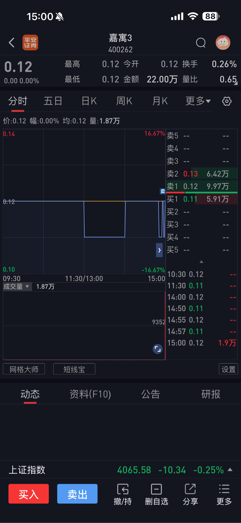 $嘉寓3(SZ400262)$ 0.11进的份额,0.12全砸出,底仓3000手不变,无所谓,出去的这900手占总成交的1/20,一个人完成的T,占一个公司总成交的1/20,知道上一篇贴你在留言区表示你不服。本人接下来继续用900手零秒隔夜单,下午马上继续挂零秒0.11买同样的份额。