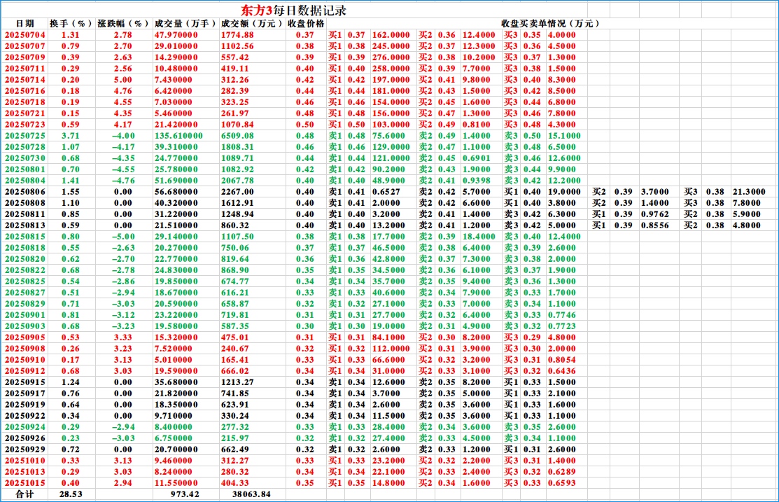$东方3(SZ400264)$ 20251015收盘后统计的东方3历史数据(含当天)。希望对朋友们分析有帮助。津信科5和东方3是我唯一持有的两支老三板股票,不买也不卖,长期持有。带着津信科5和东方3一直到2030!祝股友们股市长红!