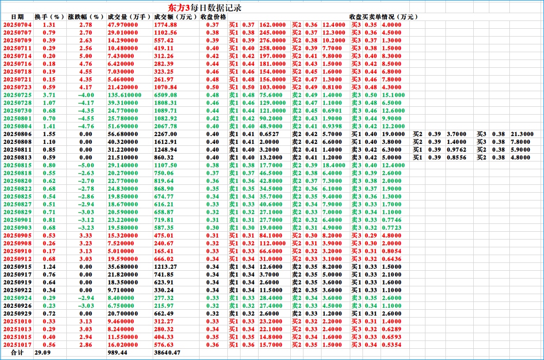 $东方3(SZ400264)$ 20251017收盘后统计的东方3历史数据(含当天)。希望对朋友们分析有帮助。津信科5和东方3是我唯一持有的两支老三板股票,不买也不卖,长期持有。带着津信科5和东方3一直到2030!祝股友们股市长红!