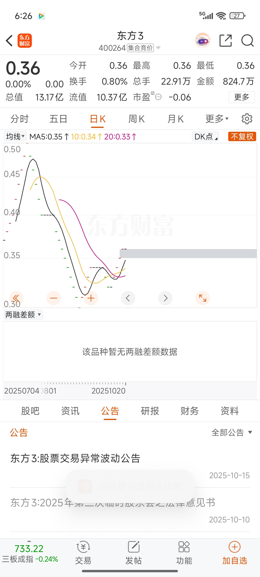 $东方3(SZ400264)$ 看走势,这次跌下来会破0.3,不管你怎么跌,不加也不减