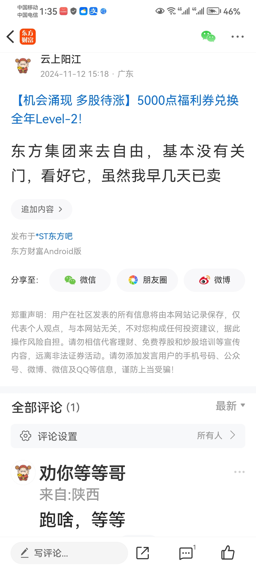 温馨提示: 1.根据《证券法》规定,禁止编造、传播虚假信息或者误导性信息,扰乱证券市场;2.用户在本社区发表的所有资料、言论等仅代表个人观点,与本网站立场无关,不对您构成任何投资建议。用户应基于自己的独立判断,自行决定证券投资并承担相应风险。《东方财富社区管理规定》