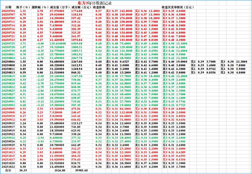 $东方3(SZ400264)$ 20251022收盘后统计的东方3历史数据(含当天)。希望对朋友们分析有帮助。津信科5和东方3是我唯一持有的两支老三板股票,不买也不卖,长期持有。带着津信科5和东方3一直到2030!祝股友们股市长红!
