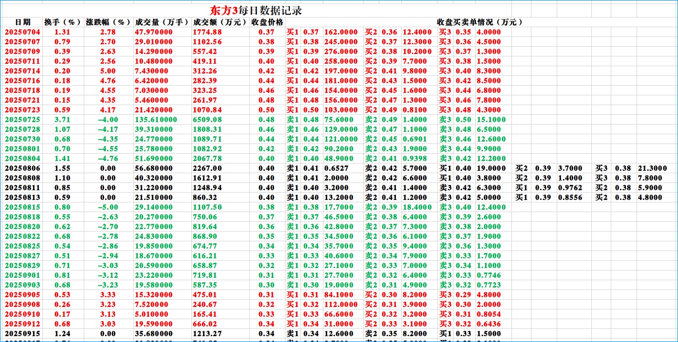 $东方3(SZ400264)$ 20251215收盘后统计的东方3历史数据(含当天)。希望对朋友们分析有帮助。津信科5和东方3是我唯一持有的两支老三板股票,不买也不卖,长期持有。带着津信科5和东方3一直到2030!祝股友们股市长红!