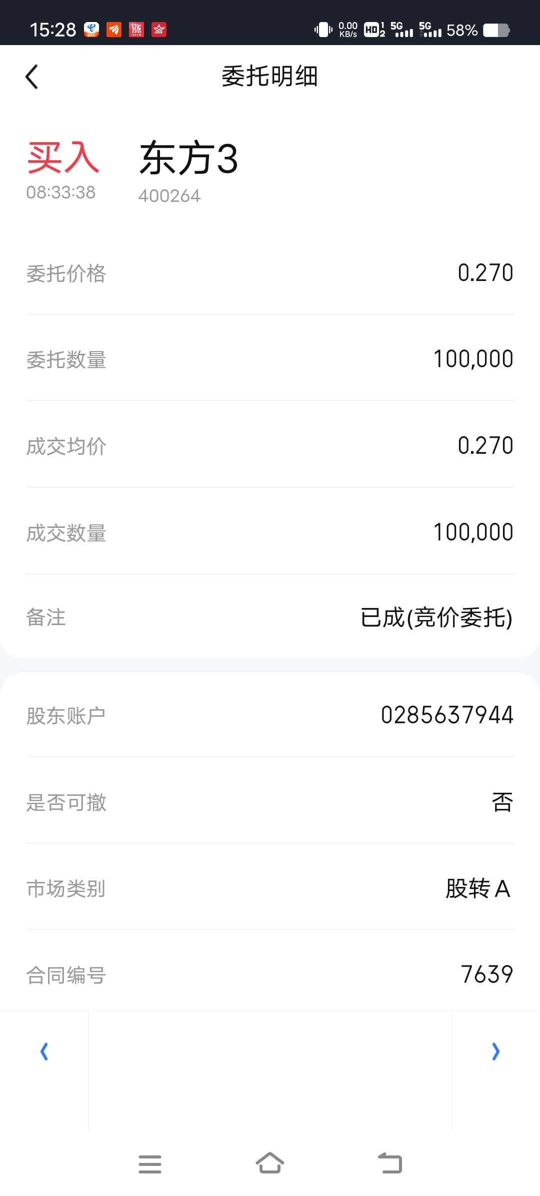 $东方3(SZ400264)$ 星期三0.26买了30万,今天挂单30万,因为涨停撤单20万,成交10万。